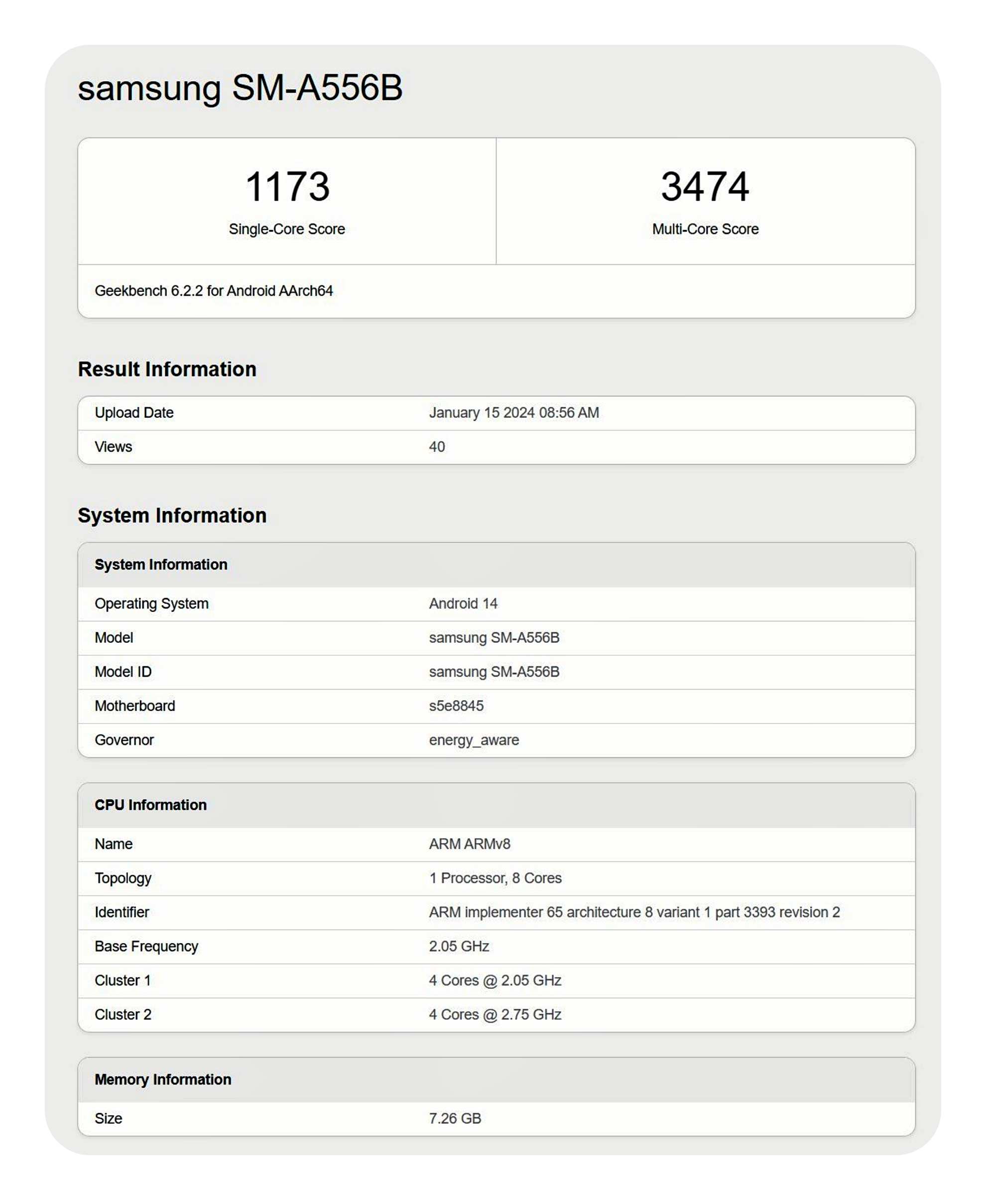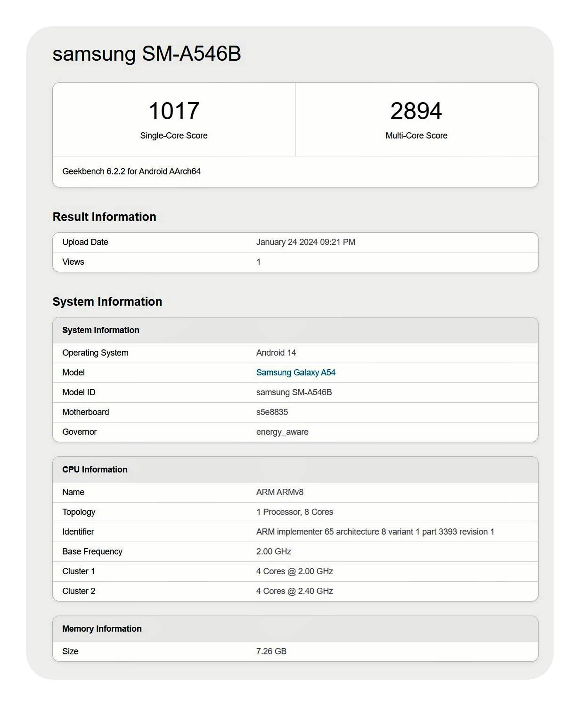 Galaxy A55에 탑재된 엑시노스 1480은 싱글코어 1170점, 멀티코어는 3500점 정도의 높은 점수를 보여주고 있다는 것입니다. 단순히 숫자로만 어느 정도 성능 향상을 이뤘는지 감이 잘 잡히지 않는 것도 사실이죠. 이전 모델인 갤럭시 A54(갤럭시 퀀텀4)의 벤치마크 자료와 비교해보면 확실한 성능 향상을 확인해 볼 수 있습니다.