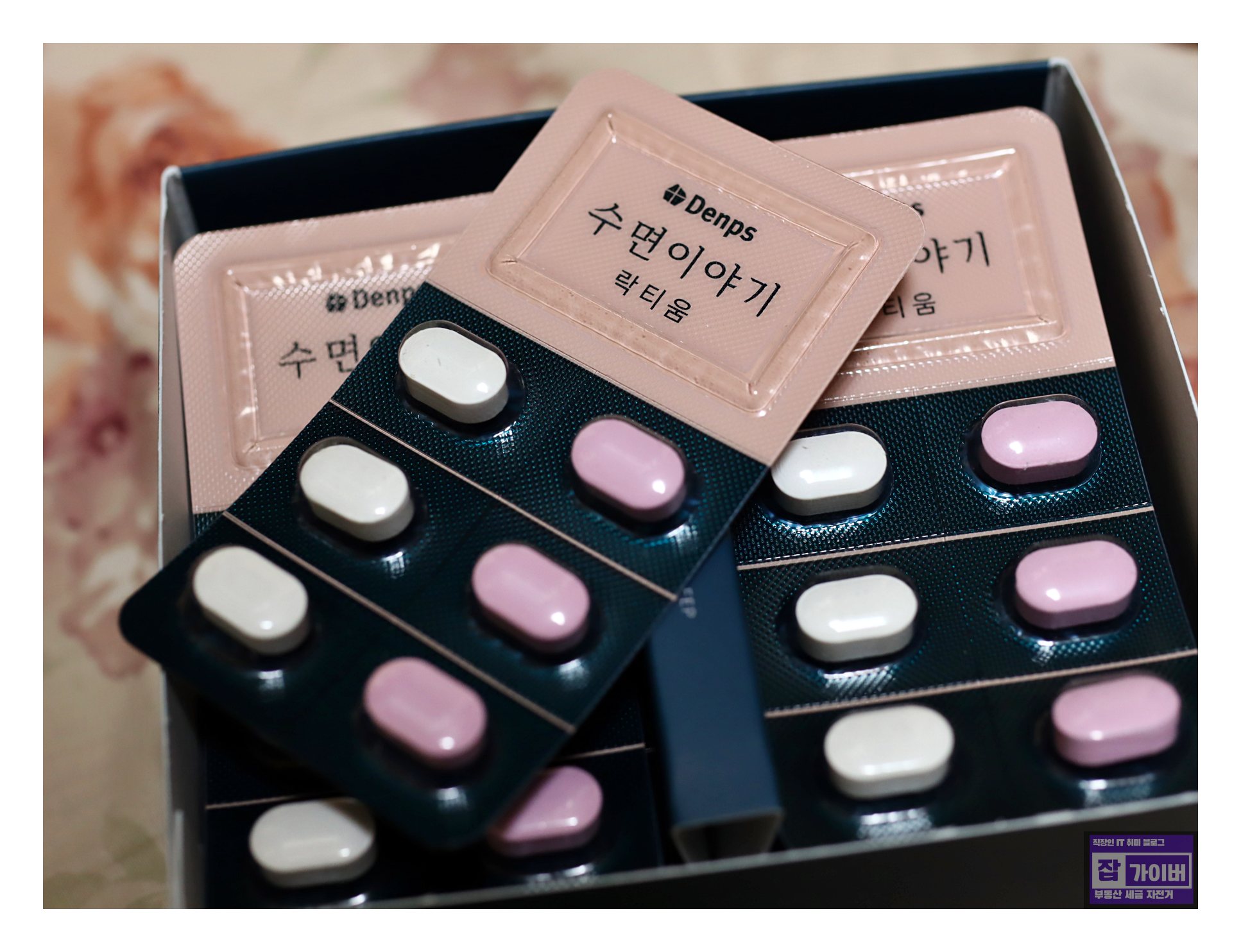 덴프스 수면이야기 락티움 제품을 사용해보니 포장부터 감성적인 느낌을 주며, 하얀색과 분홍색 캡슐로 구성되어 있습니다. 이를 1시간 전에 섭취하면 수면에 도움을 준다고 합니다.