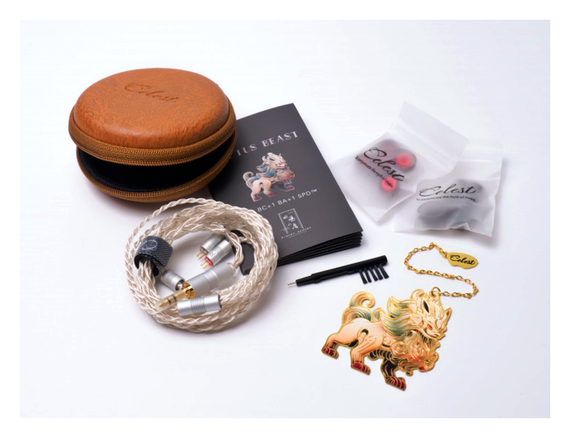 고순도 5N 은도금 동선 케이블, 다양한 이어팁, 그리고 특별한 '천록수 - Plutus Beast' 금속 책갈피 등이 포함되어 있습니다. 제품 패키지는 전면에 중국 전설 동물 '천록수(Plutus Beast)'를 프린팅하여 독특하면서도 고요한 분위기를 연출합니다.