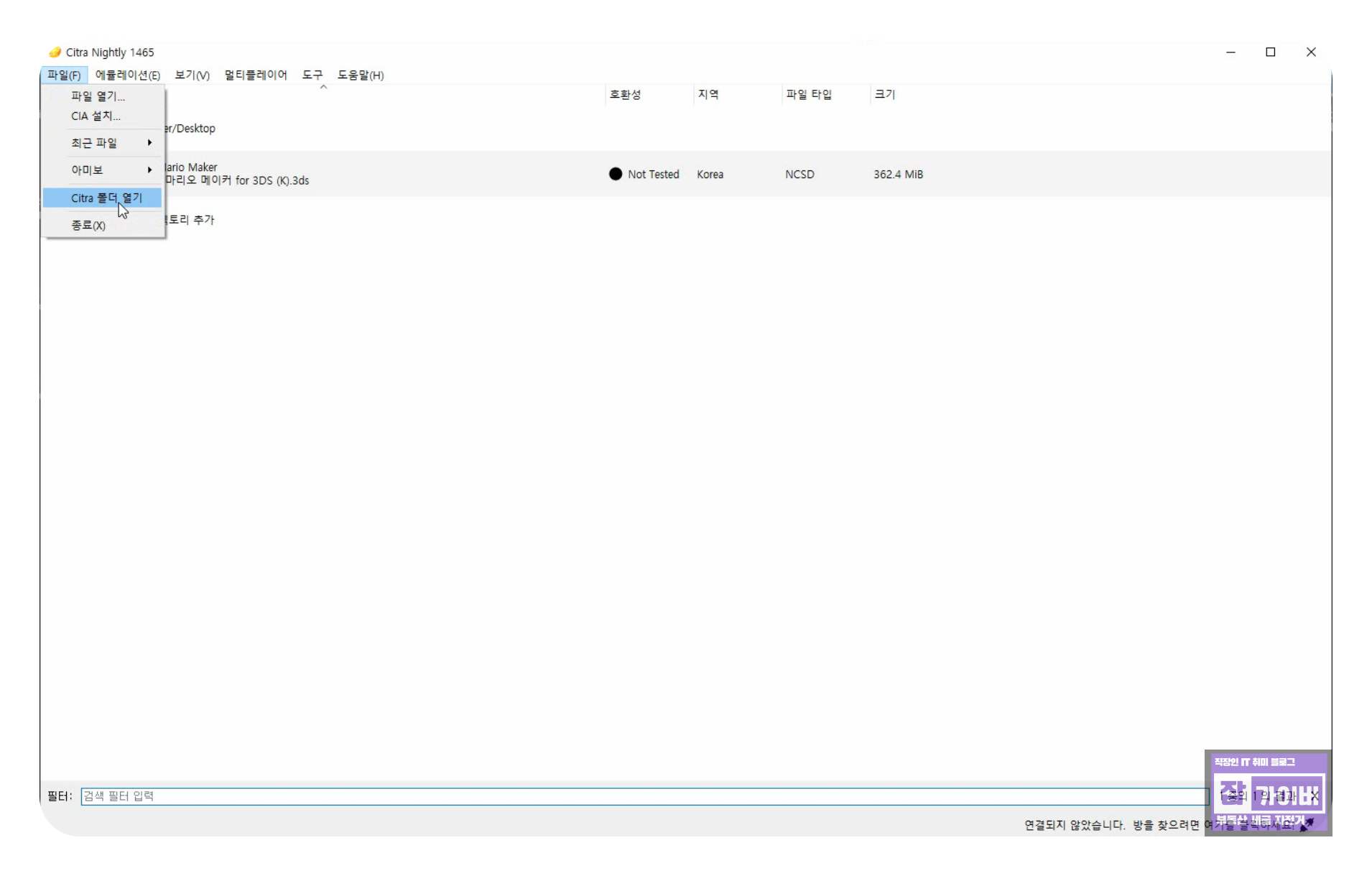 시트라를 실행하고, 메뉴에서 '파일'을 선택한 후 'Citra 폴더 열기'를 클릭합니다.