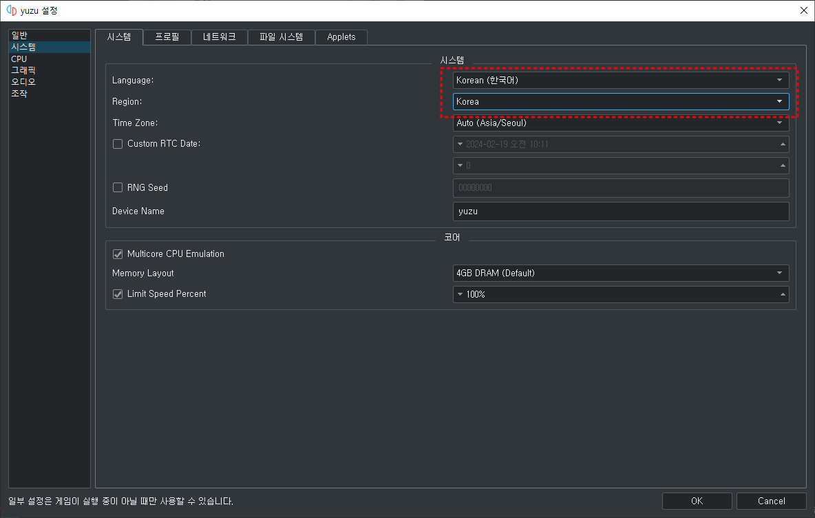 이제 Yuzu 에뮬레이터를 실행하고, 옵션에서 '시스템'으로 들어가서 언어지역 설정을 모두 한국으로 합니다.