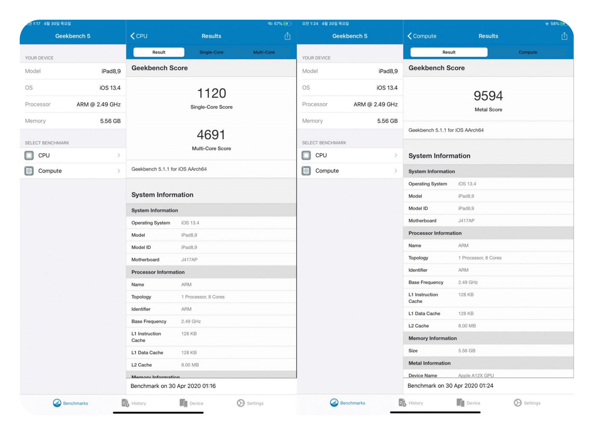 한편, 아이패드 프로 11인치 4세대는 A12X와 사실상 동일한 칩셋에 그래픽 코어만 하나 살려놓은 A12Z를 탑재하고 있습니다. 몇몇 사용자들 사이에서는 이에 대한 논란이 있었지만, 개인적으로는 6GB의 램이 추가되고 기본 용량이 128GB로 늘어난 점이 매력적으로 다가와 구매를 결정하게 되었습니다.
