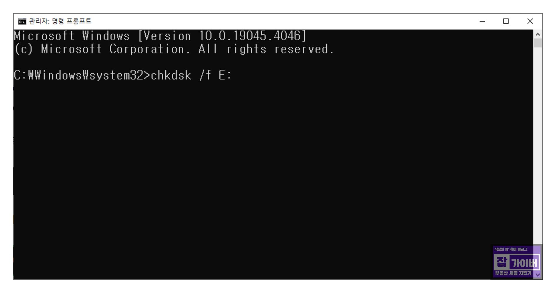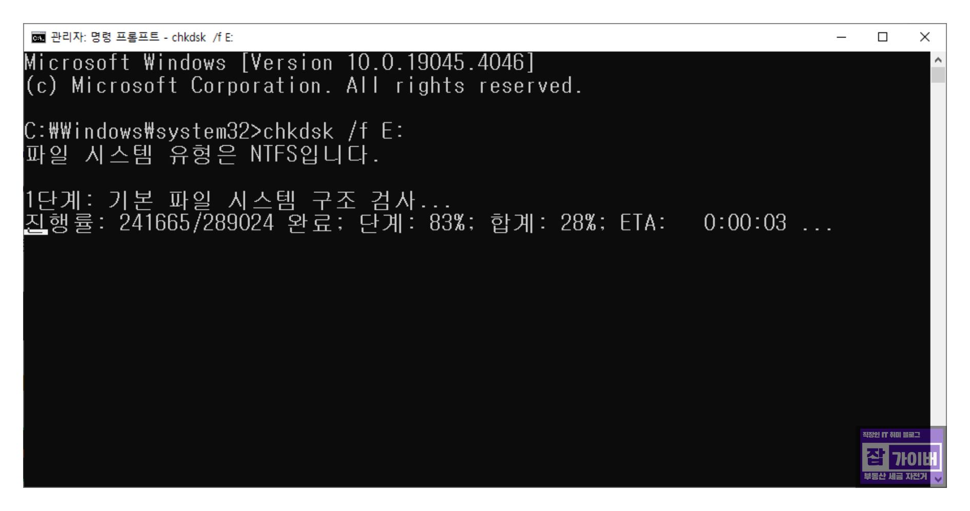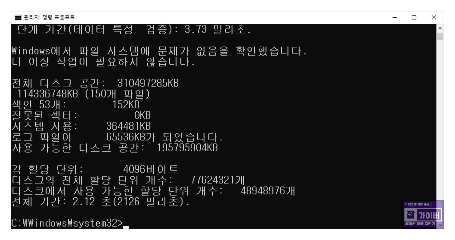 추가로 CHKDSK 명령어를 통해 손상된 배드섹터를 검사하고 치료합니다.