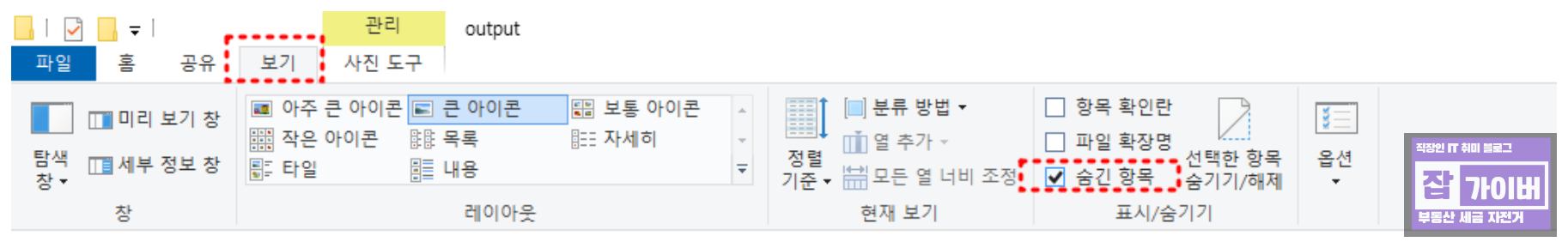 우선 파일탐색기에서 보기탭으로 이동 후 숨긴 항목을 체크가 되어 있는지 확인합니다.