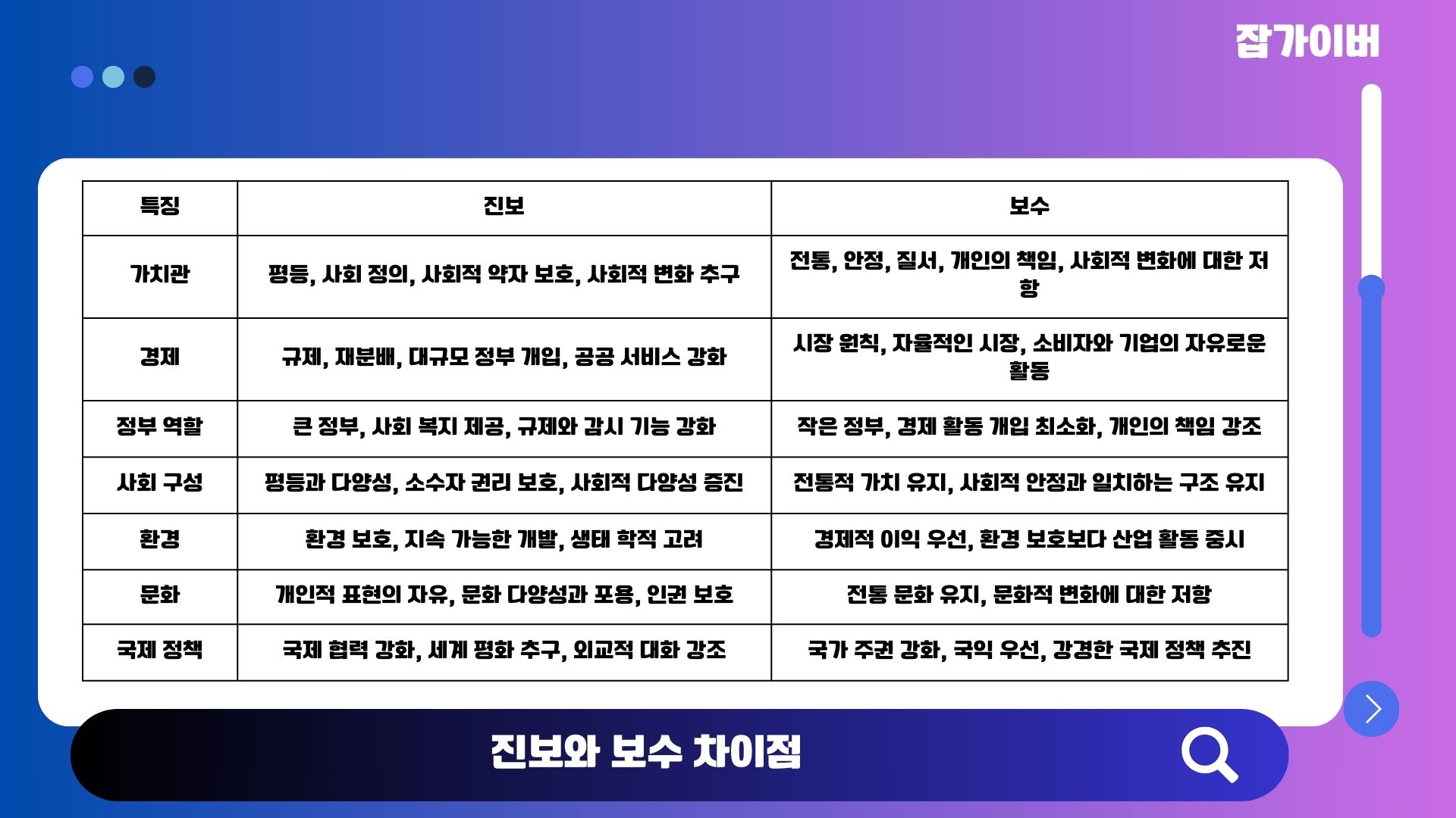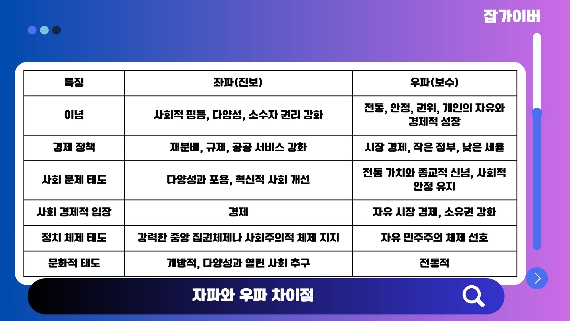 | 가치관 | 평등, 사회 정의, 사회적 약자 보호, 사회적 변화 추구 | 전통, 안정, 질서, 개인의 책임, 사회적 변화에 대한 저항 |