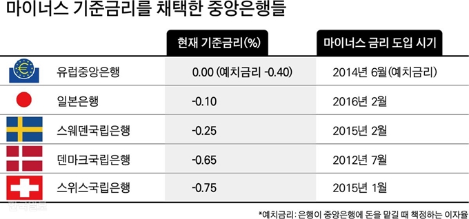 | 국가 | 중앙은행 | 마이너스 금리 도입 시기 | 현재 적용 중인 마이너스 금리 (%) |