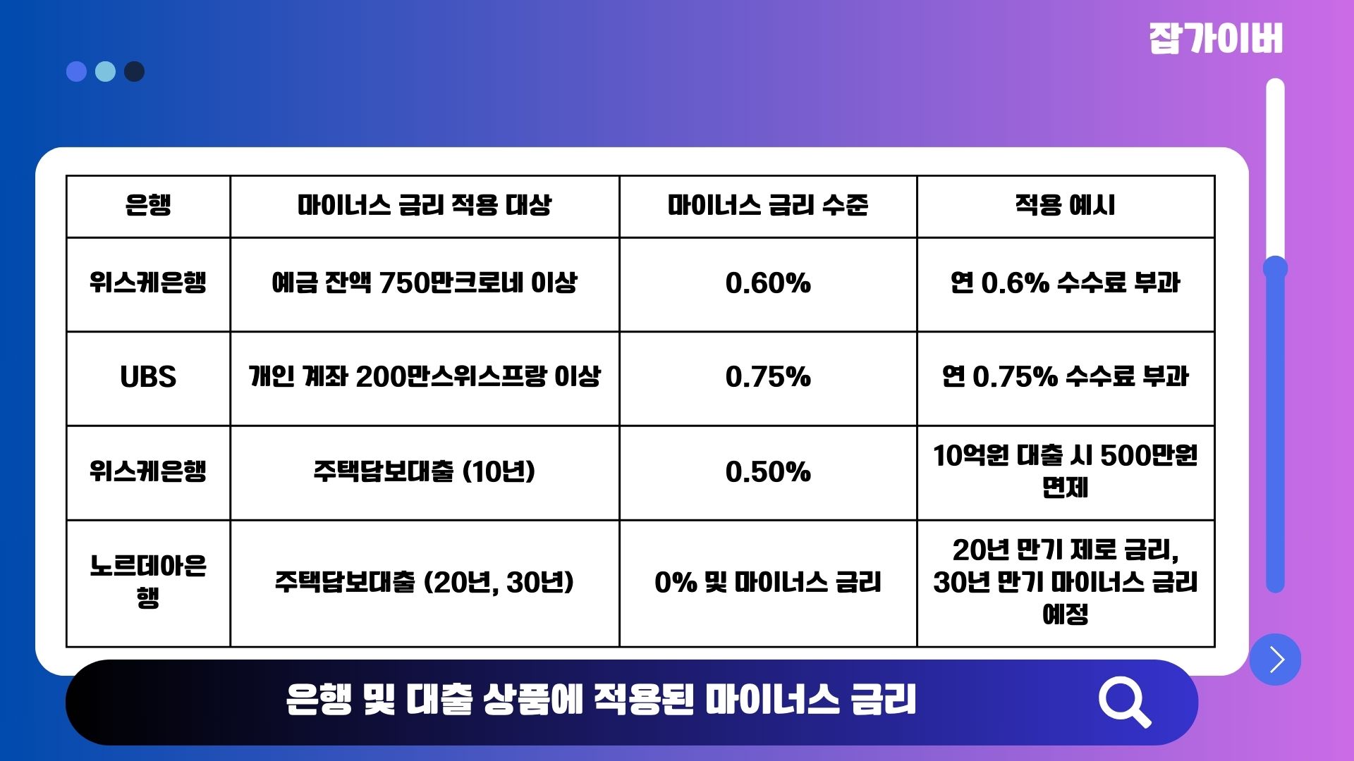 | UBS (스위스) | 개인 계좌 (잔액 200만스위스프랑 이상) | 예, 2022년 11월부터 | -0.75 |