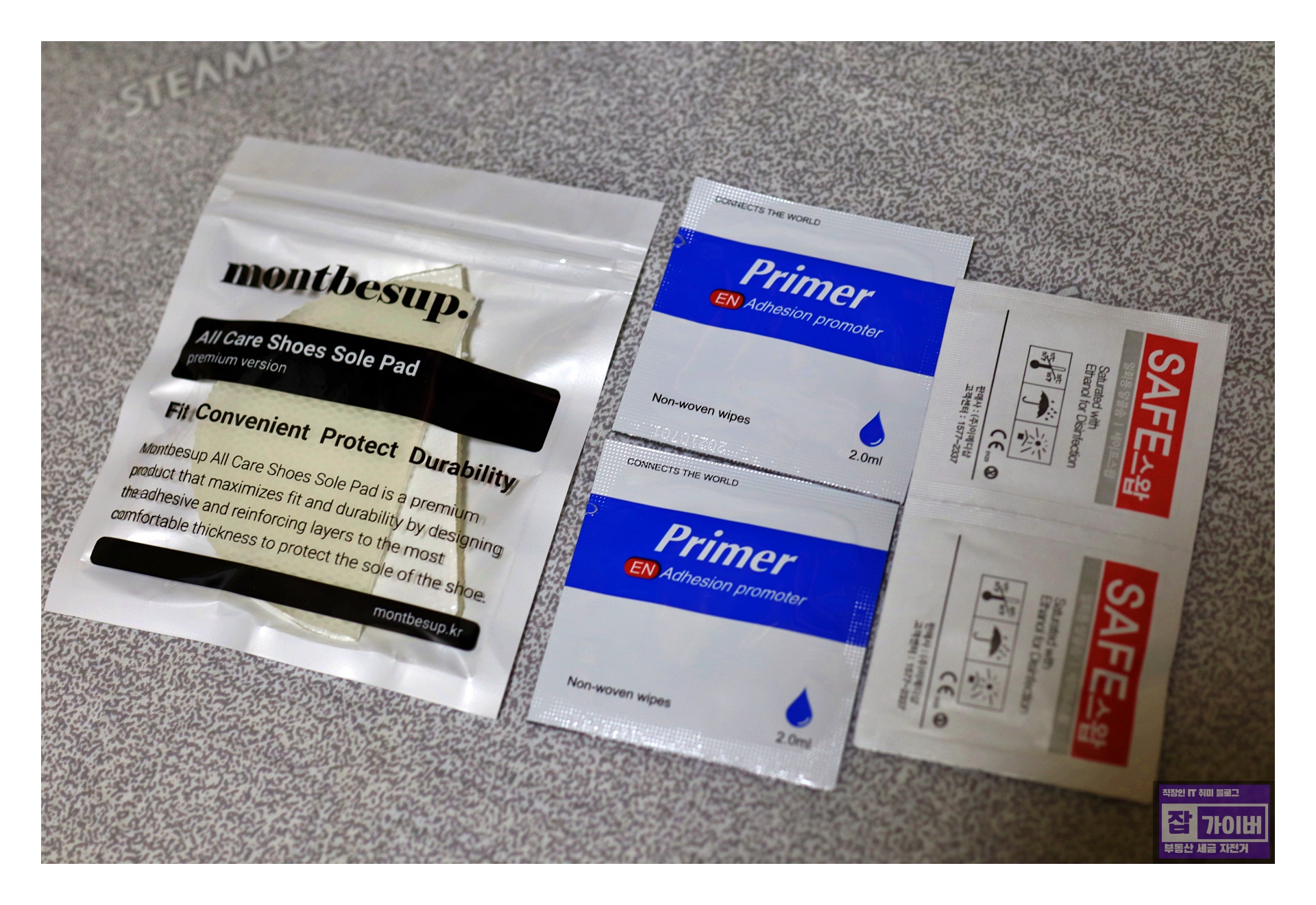 제품 구성품으로는 신발 뒷꿈치 패드 2개, 접착증진제 프림어 2개, 알콜스왑 2개가 포함되어 있으며 뒷굼치 패드 부착방법은 간단하여 누구나 손쉽게 적용할 수 있었습니다.
