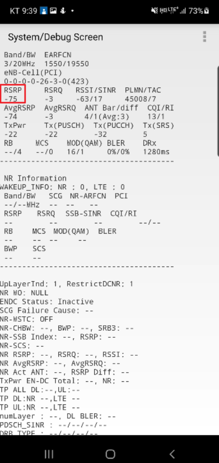 4. 빨간 박스 안에 있는 RSRP(Reference Signal Received Power)를 확인합니다. RSRP는 안테나가 수신한 전파의 세기를 나타냅니다.