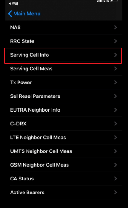 4. Serving Cell Info를 클릭합니다. 이는 현재 기지국에 연결된 정보를 보여줍니다.