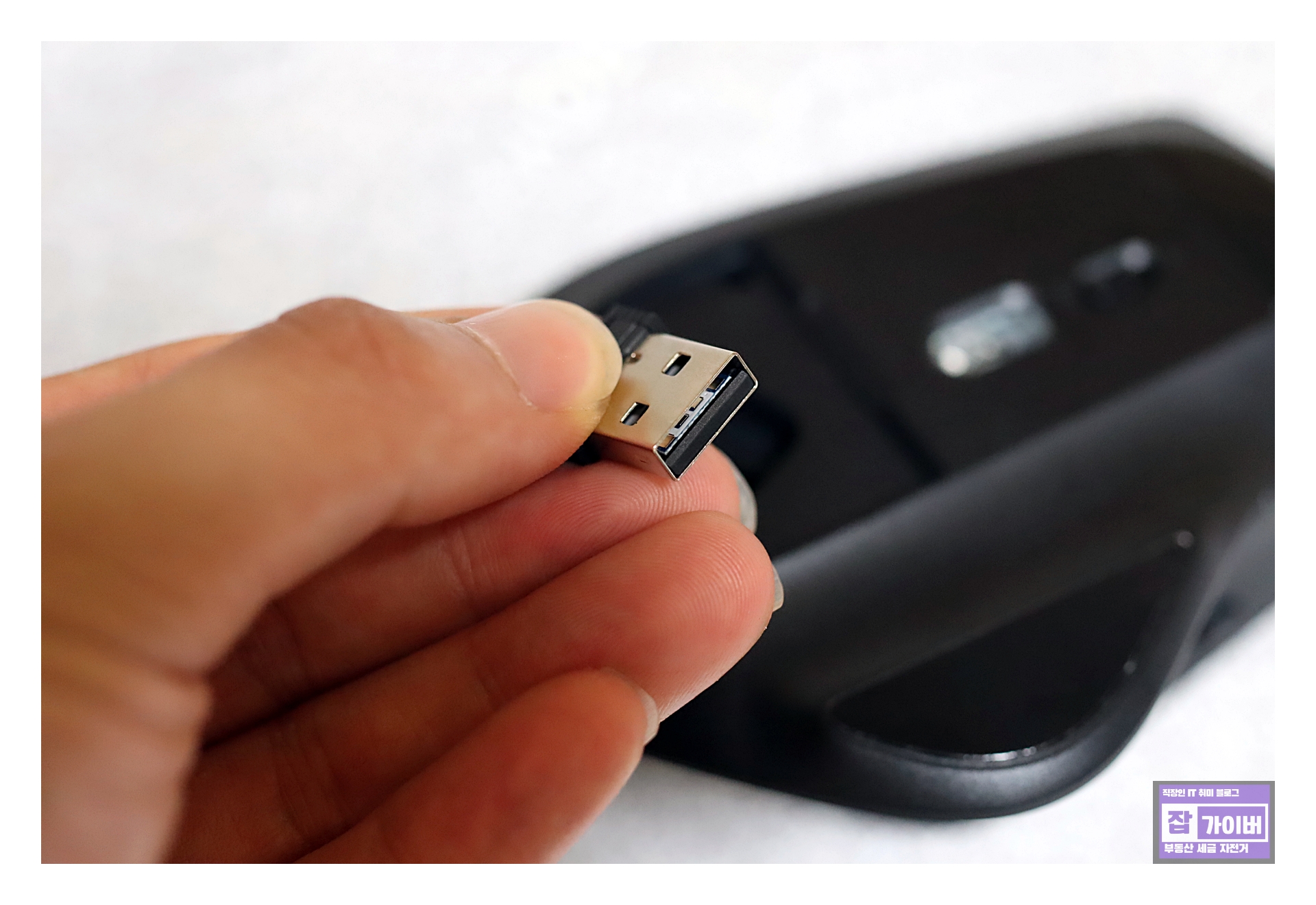 아이노트 트리플 모드 무선 충전마우스의 충전포트는 마우스 정면에 있으며, 일반 스마트폰 충전기로 충전이 가능합니다. USB 리시버는 마우스 바닥에 마그네틱으로 된 하우징을 제거하면 나옵니다. 사용하지 않을 때에는 보관도 가능하며, 추가 슬롯으로는 USB-C 젠더를 수납 가능한 공간도 있습니다.