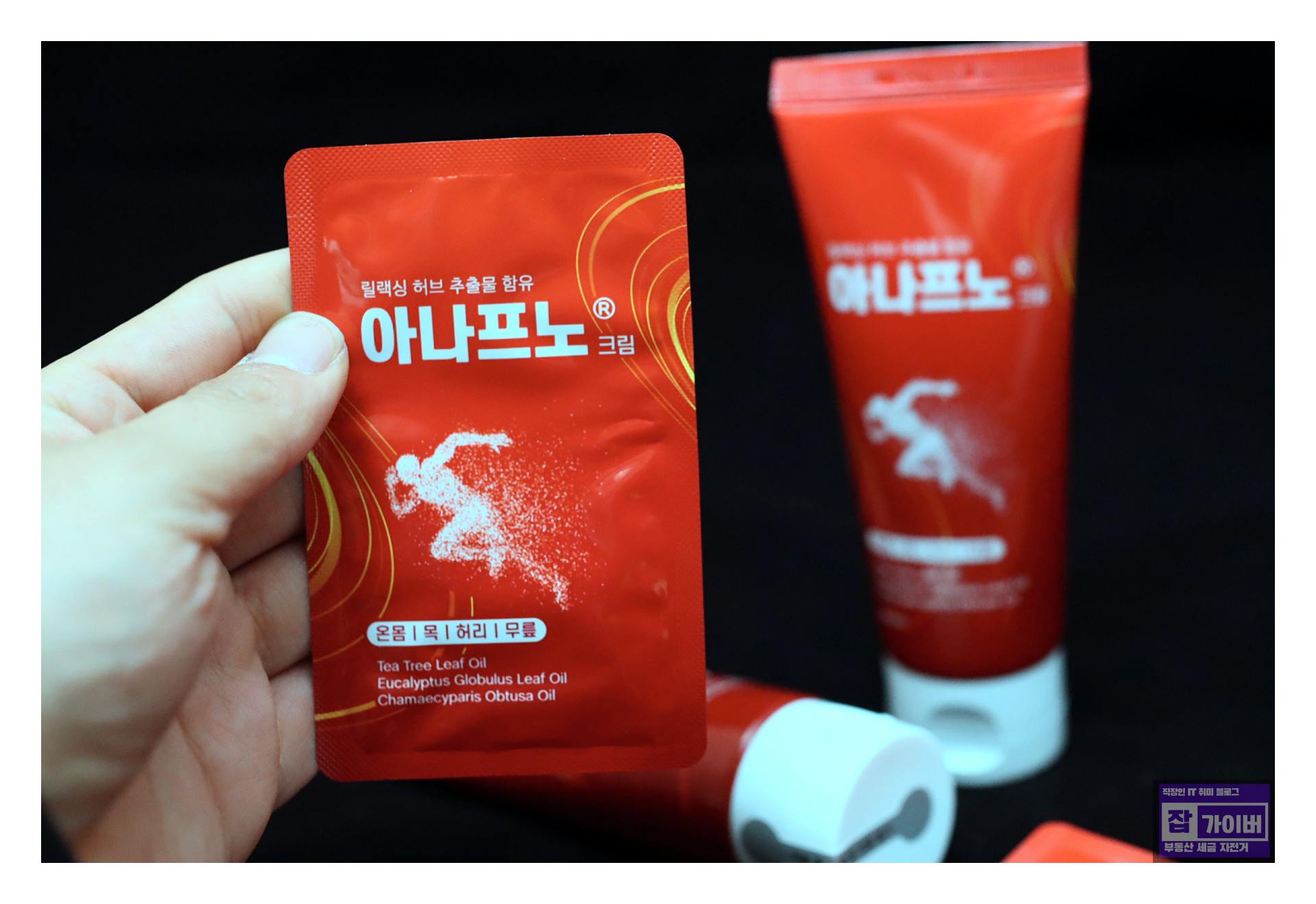 아나프로 마사지크림의 중요성분으로는는 티트리오일, 유칼립투스오일, 편맥오일, 멘톨 등의 아로마 오일이 함유되어 있어, 긴장된 몸과 마음을 릴렉스하게 하는데 도움이 되었고, 피부진정에 좋은 병풀추출물이 함께 함유되어 있어 지친 피부를 촉촉하게 해주었습니다.