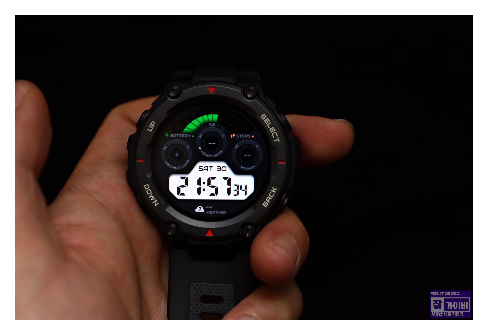 샤오미 어메이즈핏 티렉스 프로는 쥐샥을 닮은 남성적인 디자인을 지니고 있으며, 아웃도어용으로 출시된 만큼 내구성과 방수 기능에 집중하여 두께가 꽤 두꺼운 편입니다.