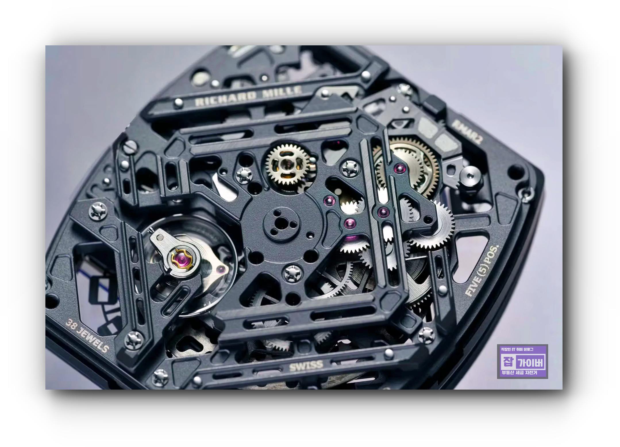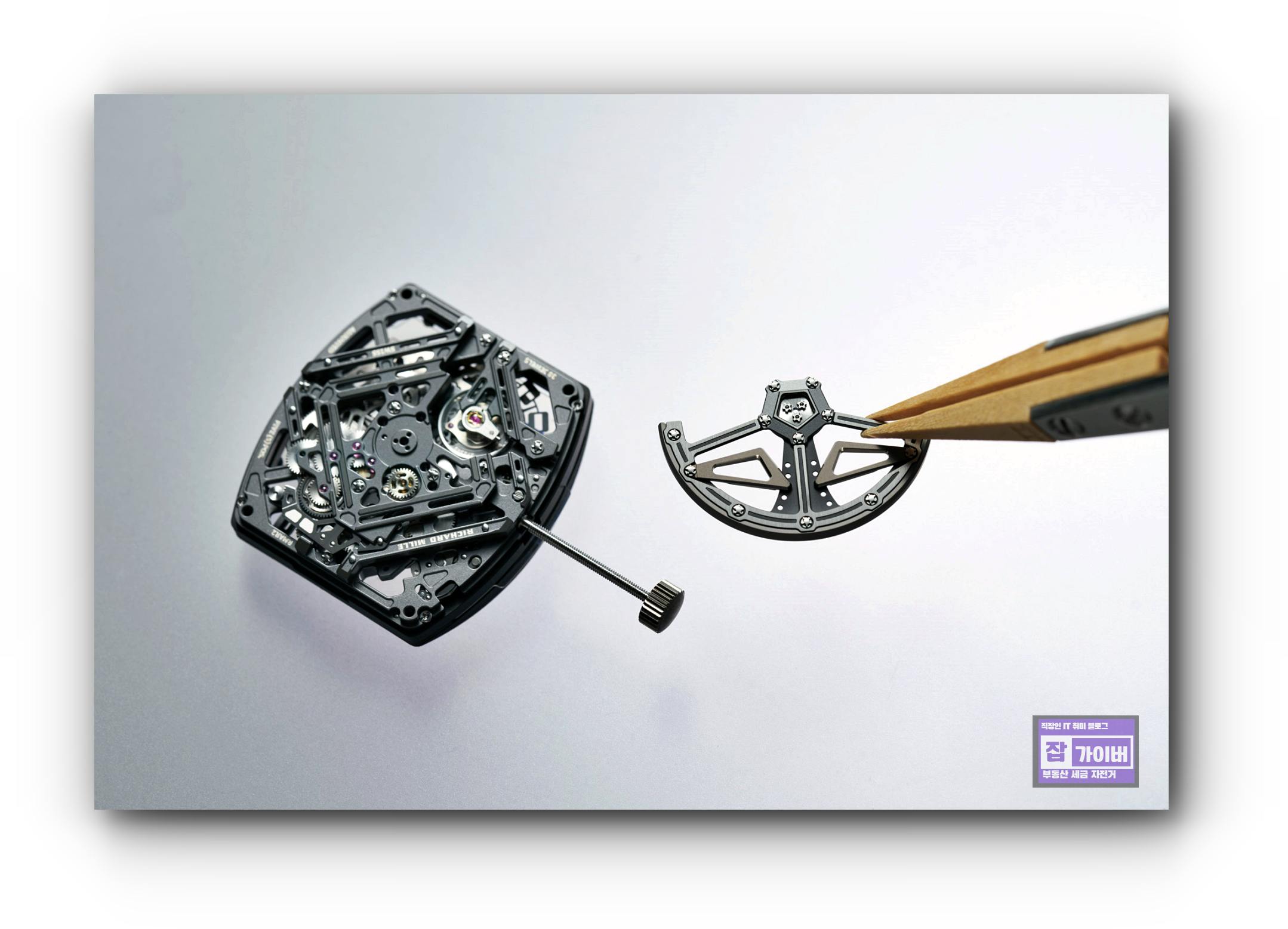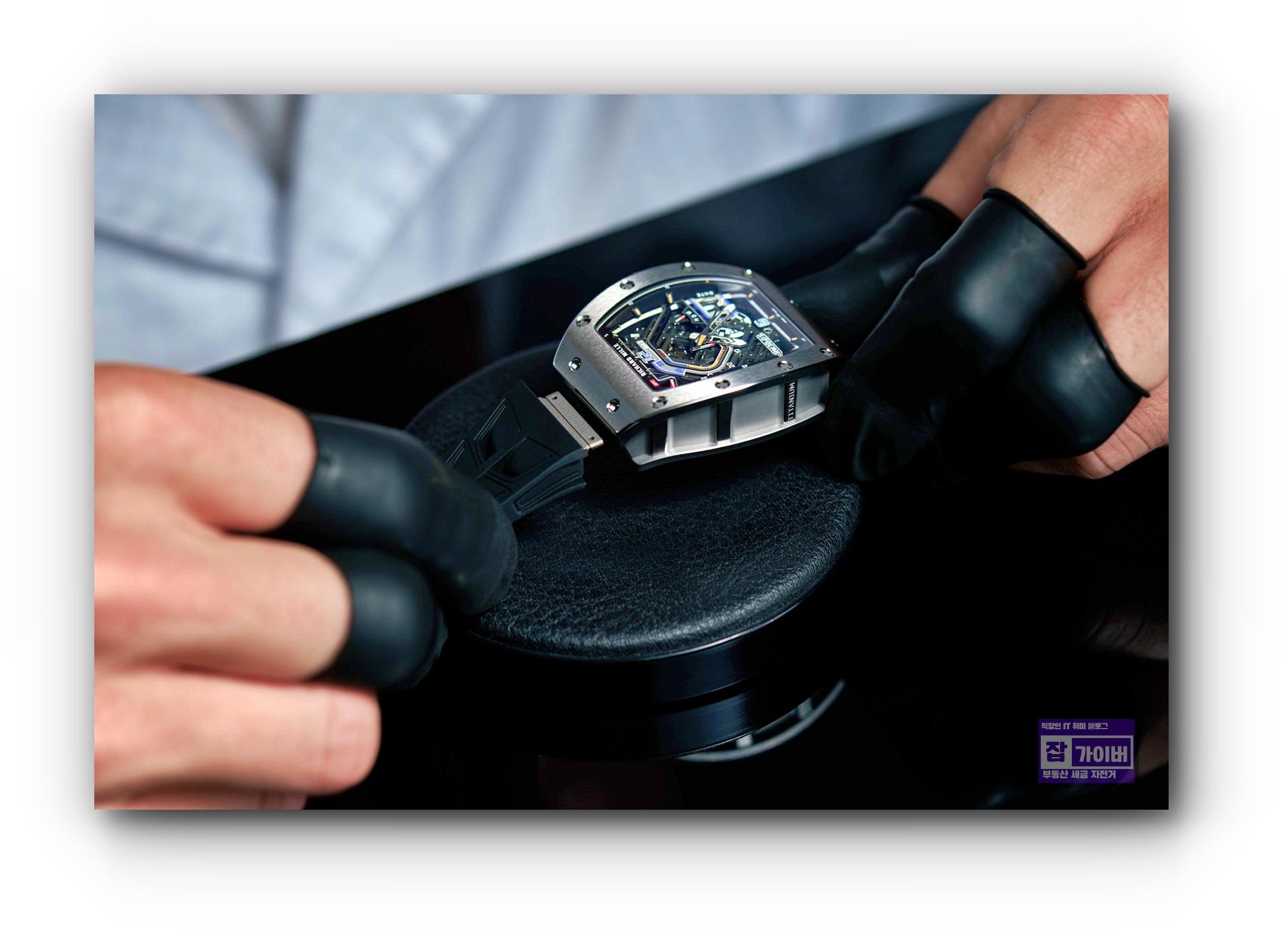 케이스의 표면은 습식 샌드블래스트와 그레이 컬러 일렉트로플라즈마(Electroplasma, 전기플라즈마) 처리를 거쳐 탁월한 내마모성을 갖추었으며, 배럴 브릿지는 블랙 PVD 코팅을 적용하여 고급스러운 느낌을 연출했습니다. 또한 스켈레톤 브릿지의 가장자리는 앵글라주 마감으로 섬세하게 마무리되었습니다. 리차드 밀의 특유한 피니싱 기술이 이 시계의 완성도를 높여주었습니다.
