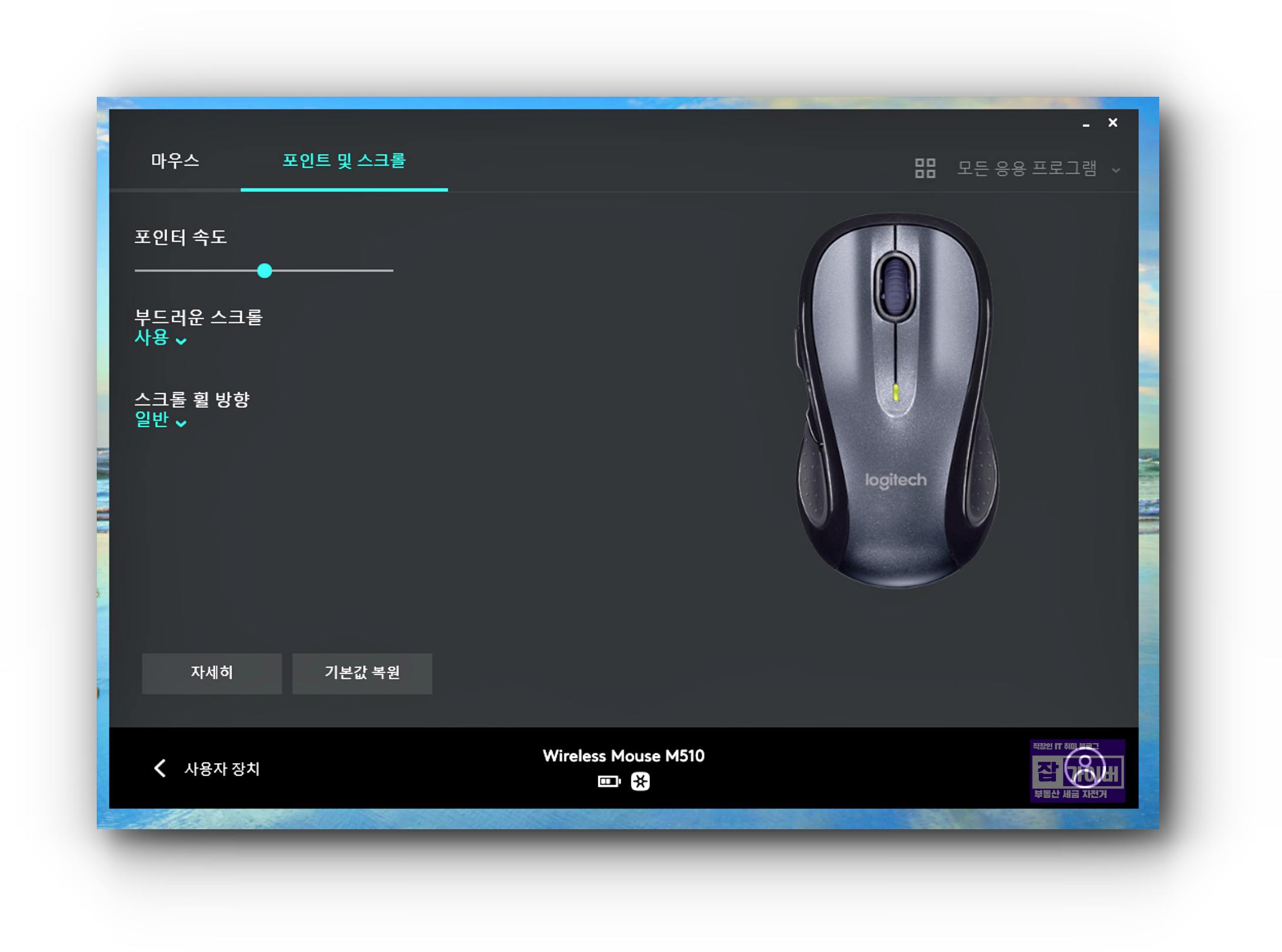 마우스의 경우에도 왼쪽/오른쪽 버튼 교체나 스크롤 속도 등을 개인 취향에 맞게 설정할 수 있습니다.