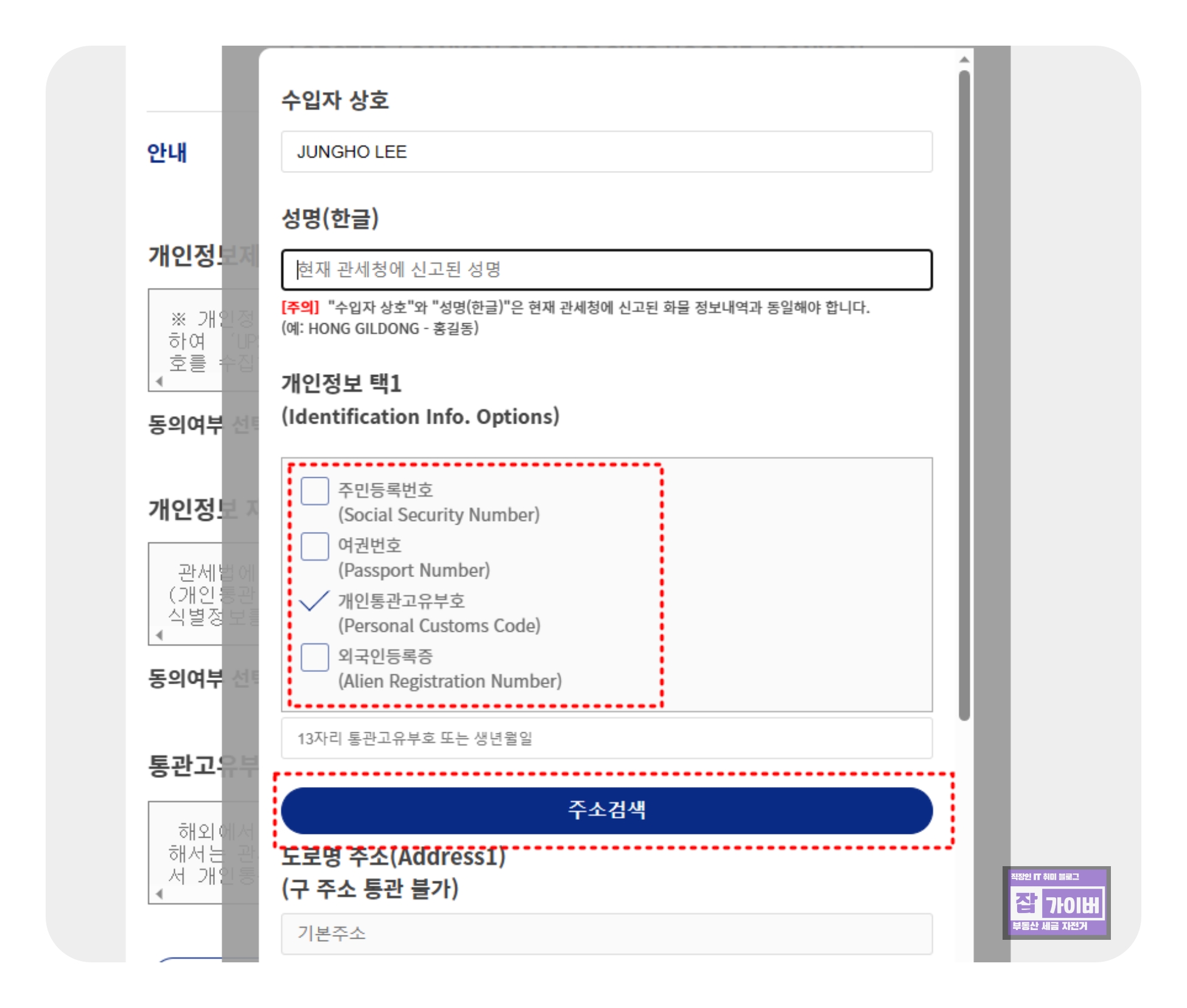 이후 통관공유부호 입력 후 수입자 이름을 영어 한글 각각 입력하고 개인정보로 주민등록번호, 연권번호, 개인통관고유부호, 외국인등록증 중 선택해서 정보를 입력합니다.