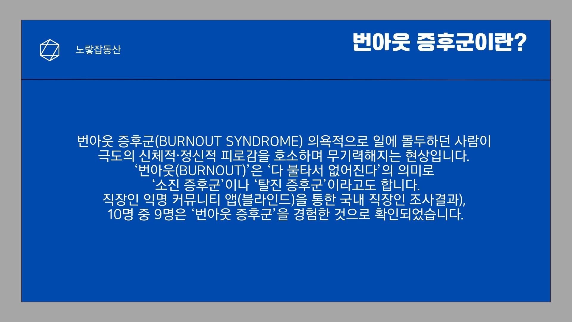 직장인 익명 커뮤니티 앱(블라인드)을 통한 국내 직장인 조사결과, 10명 중 9명은 '번아웃 증후군'을 경험한 것으로 나타났습니다.
