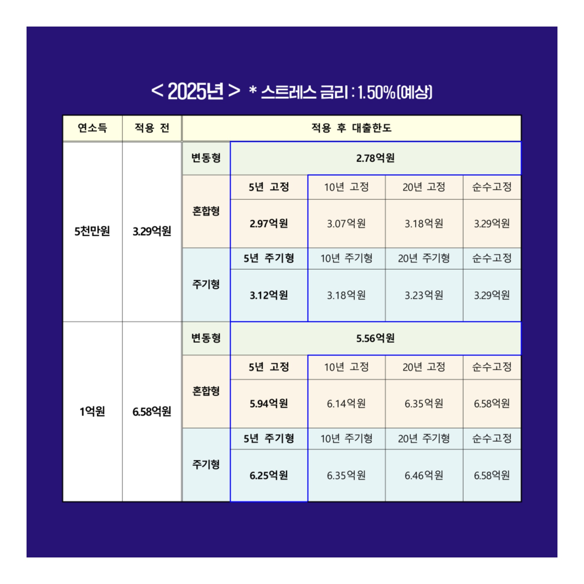 대출 방식에 따라 스트레스 금리는 달리 적용됩니다. 변동금리 상품에는 가산금리가 1.5% 모두 반영되고, 혼합형(5년 고정금리 후 변동금리로 전환) 상품은 가산금리의 60%인 0.9%가 적용됩니다.