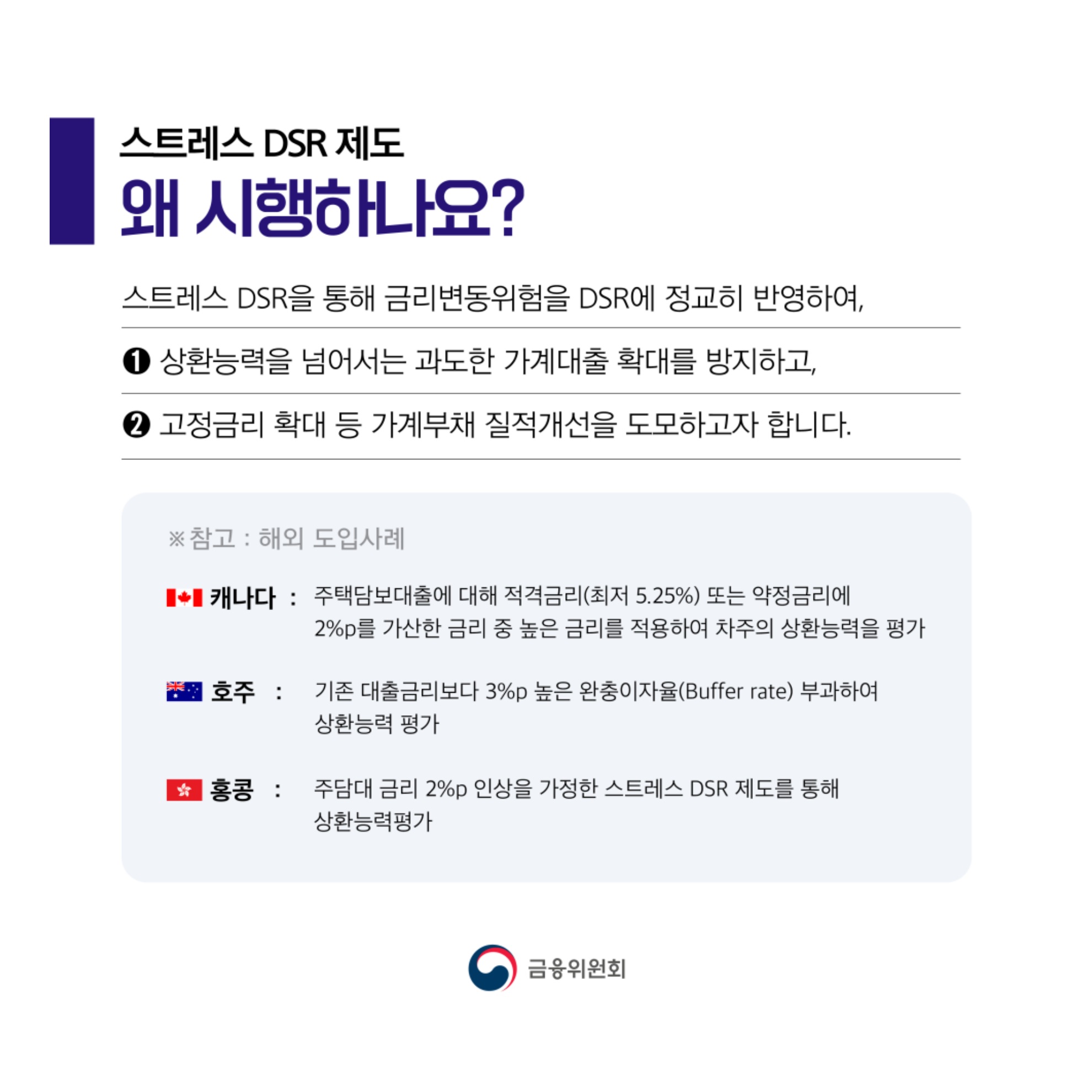 하지만 이번에 도입되는 '스트레스 DSR'은 변동금리(혼합·주기형 포함) 대출 차주의 DSR 산정 시 향후 금리인상 가능성을 반영해 가산금리를 부과하는 것이 가장 큰 차이점입니다.