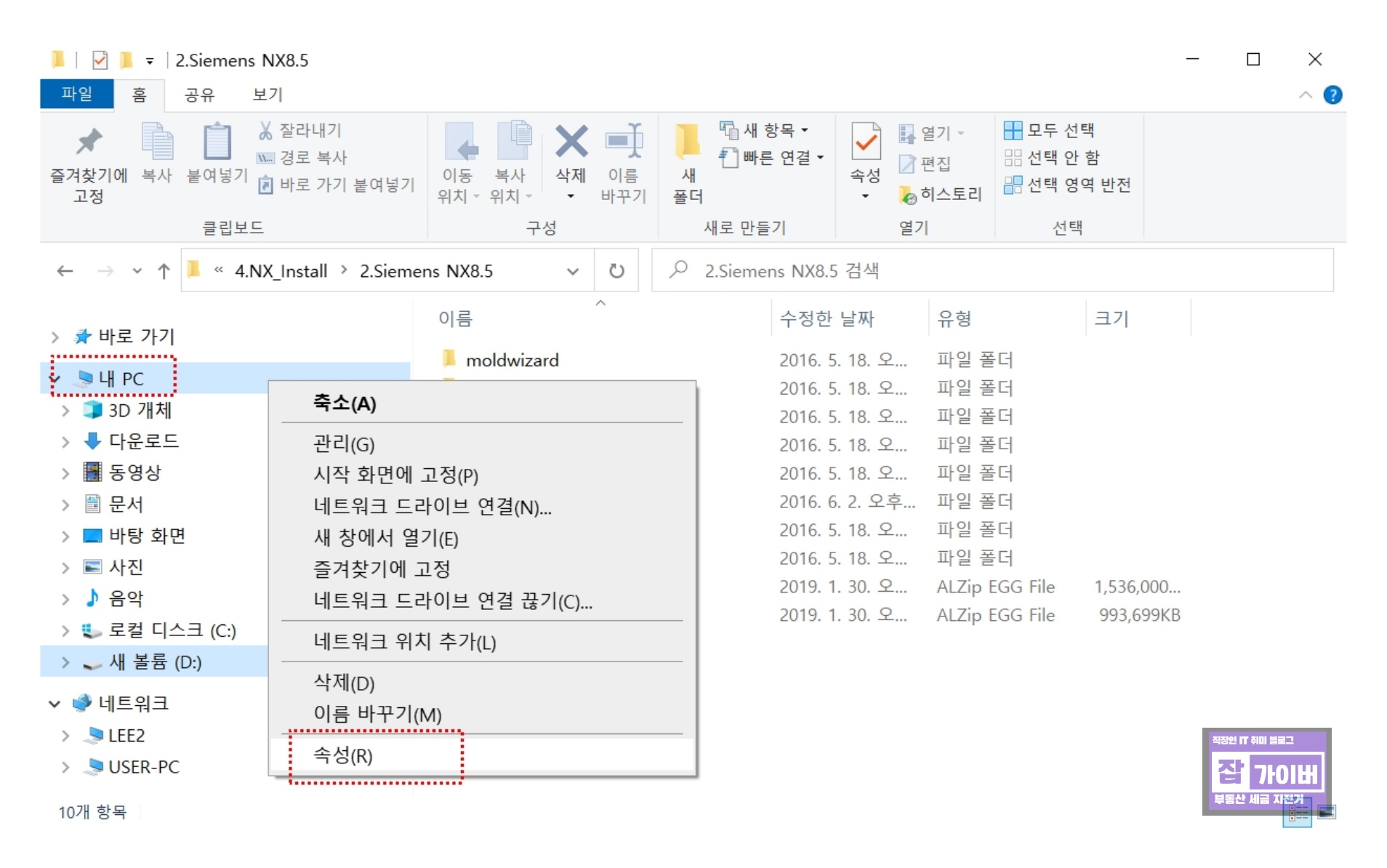 현재 설치 된 윈도우 운영체제 버전을 확인하기 위해서는 파일탐색기에서 내PC를 선택 후 속성으로 들어갑니다.