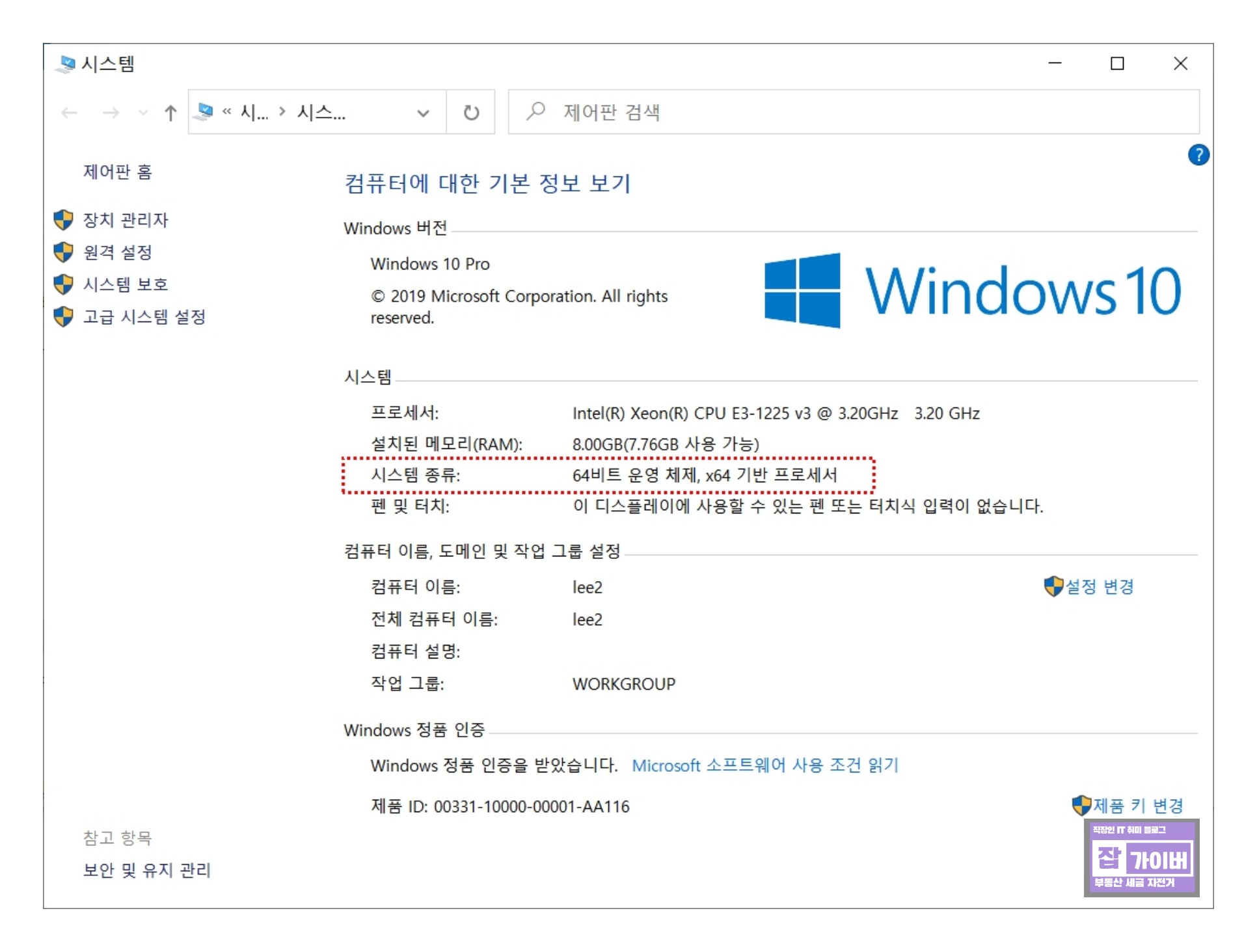 그럼 현재 설치된 윈도우 버전 및 시스템 종류에서 32비트 및 32비트를 확인할 수 있습니다.
