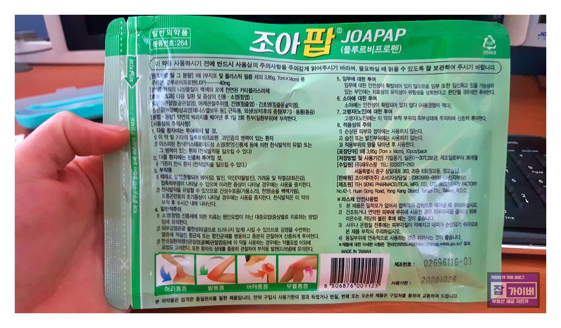 한 가지 특이한 사실은 조아팝 파스의 제조회사는 사실 국내의 조아제약이 아니라 TEH SENG 이라고 하는 대만 타이난 시에 위치하고 있는 제약회사라는 것인데 이 회사는 붙이는 형태의 의약품을 전문적으로 생산하고 있습니다.