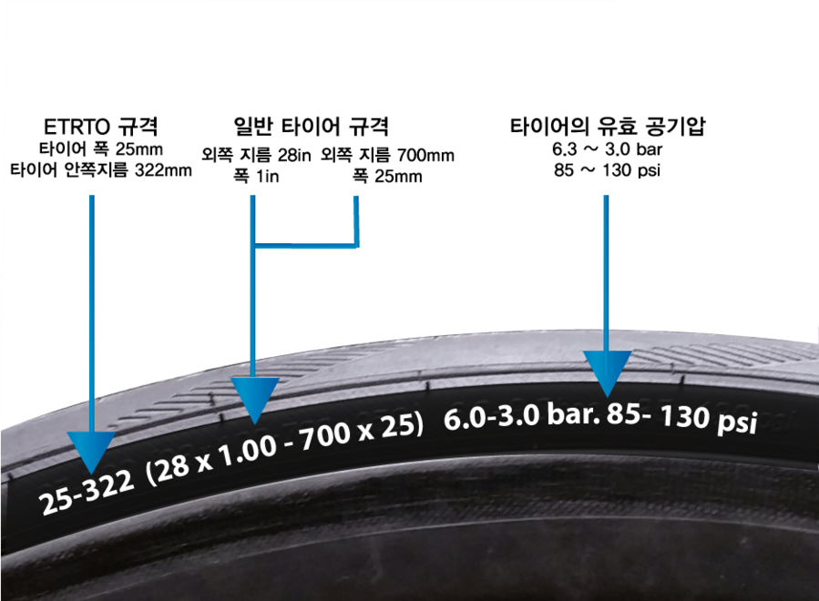타이어 사이즈를 헷갈리지 않으려면, 내 자전거 휠이 몇 mm ETRTO인지를 먼저 알아야 합니다. 이건 타이어 옆면만 봐도 바로 확인할 수 있어요.