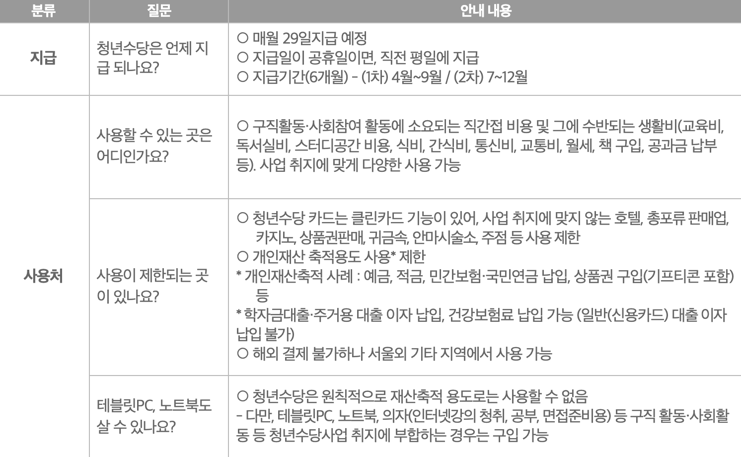 - 청년수당 사용처에 대한 투명한 예산 집행과 관리가 강화됩니다.