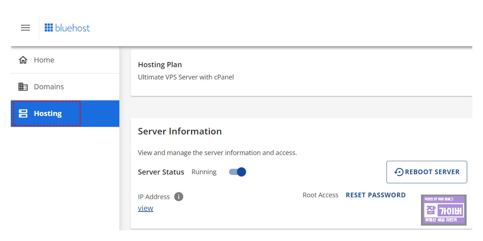 저는 현재 블루호스트 VPS 얼티메이트 호스팅 플랜을 사용 중에 있으며 Hosting 항목을 선택합니다.