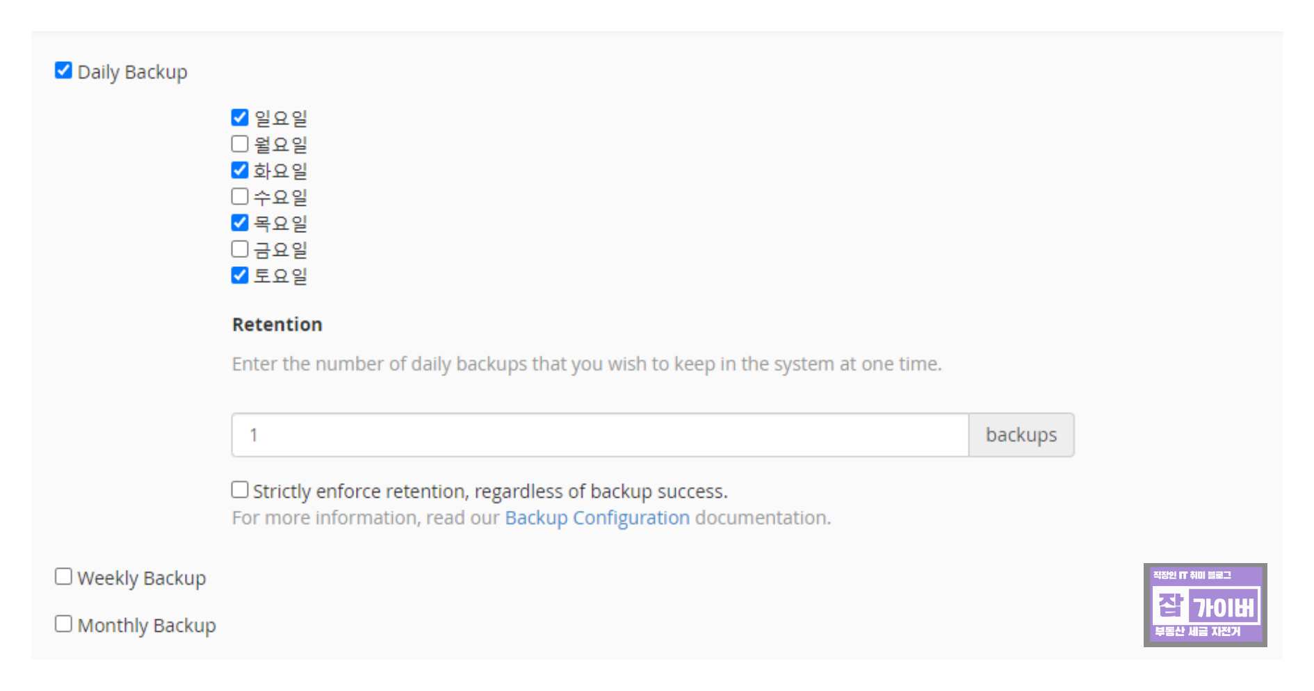 우선 저는 Daily Backup 중 월화수목금토일 중 일 화 목 토 4일만 자동백업 되도록 설정했으며 백업본은 1개만 생성되도록 했습니다.