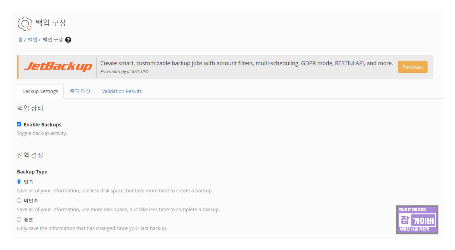 백업구성으로 들어가면 백업을 활성화하거나 비활성화 할 수 있으며 자동백업 시 파일을 압축할것인지 압축하지 않을지 등을 설정할 수 있습니다.