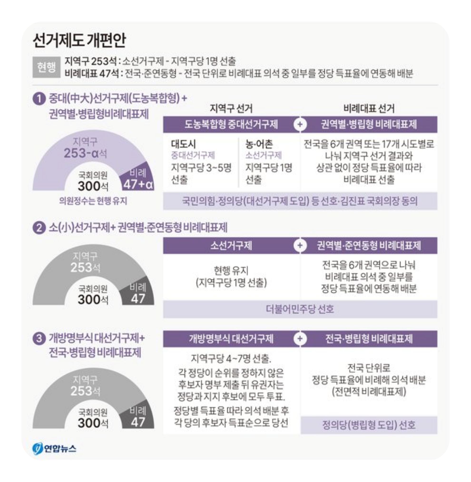 그러나 현행 제도와의 차이를 줄이기 위해 최근에는 준연동형 비례대표제가 도입되기도 했습니다.