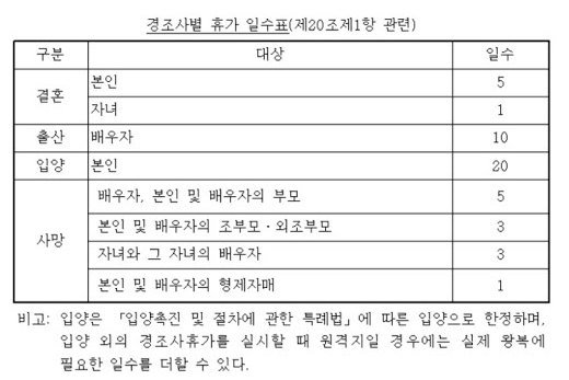 경조사별 휴가일수 표 (제20조 1항)