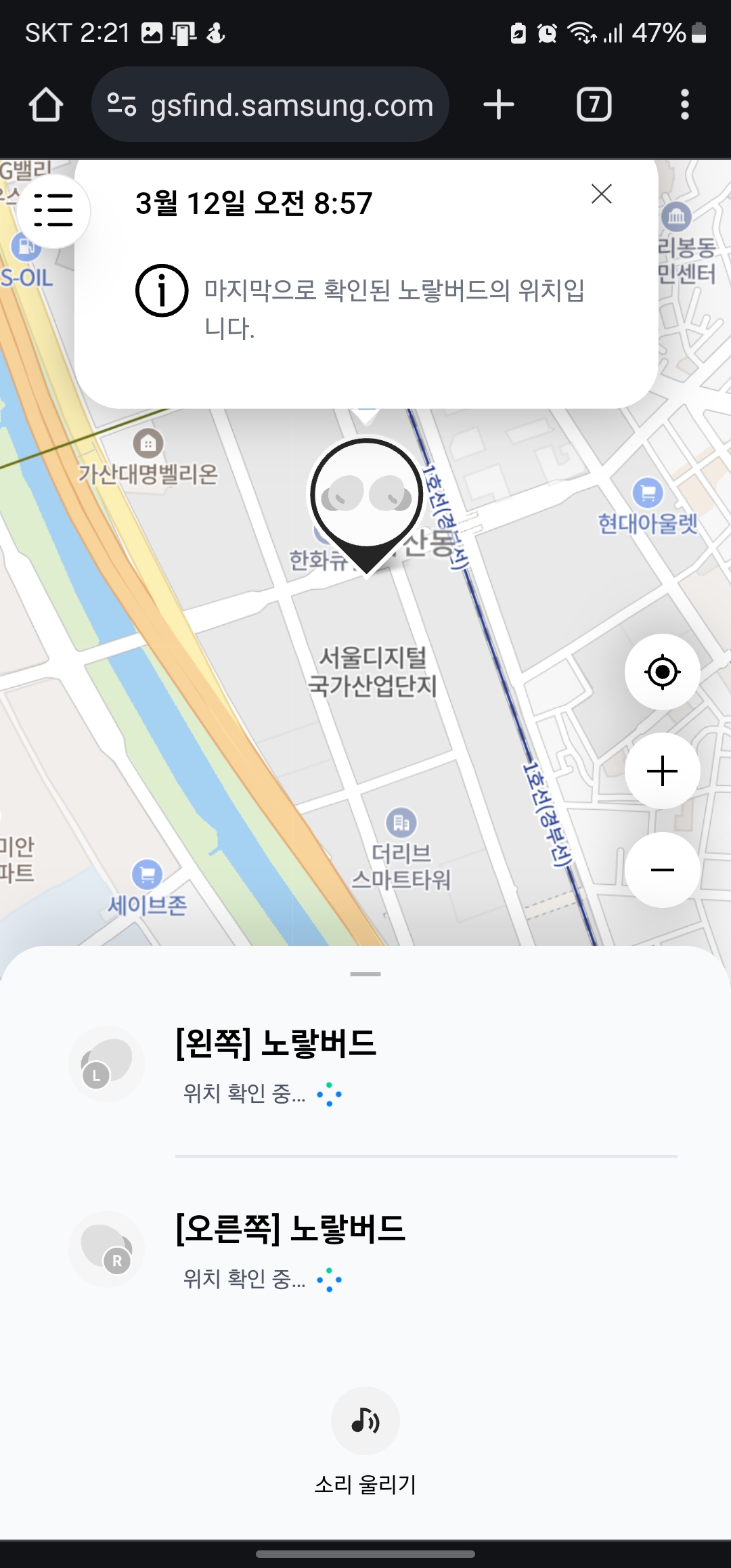 갤럭시 버즈를 실내에서 분실했는데, 소리 울리기가 작아서 잘 안 들려요