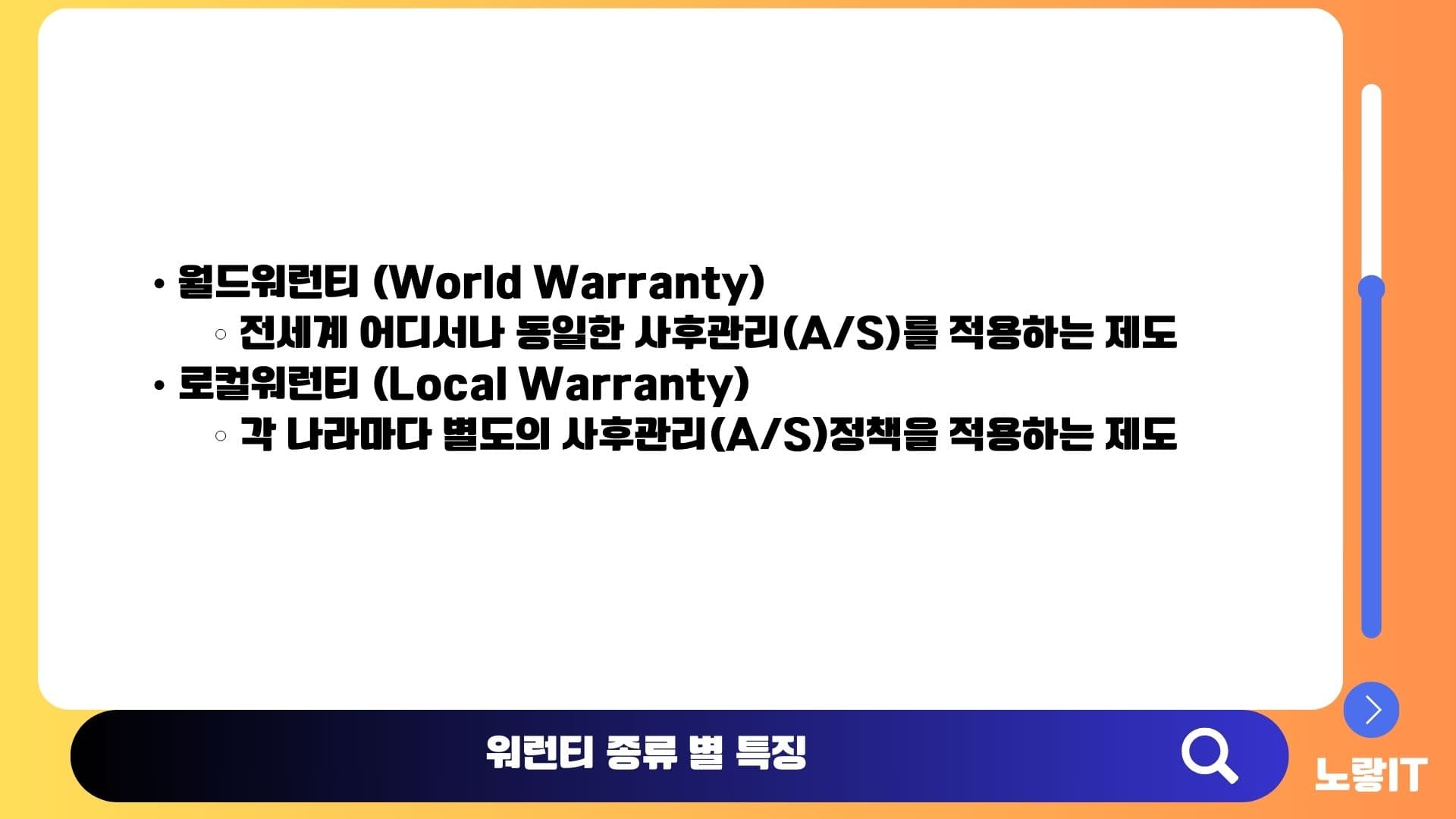 - 글로벌 워런티는 ‘판매국가’와 ‘모델코드’ 기준으로 다르게 적용되므로 구매 전 반드시 모델명 확인