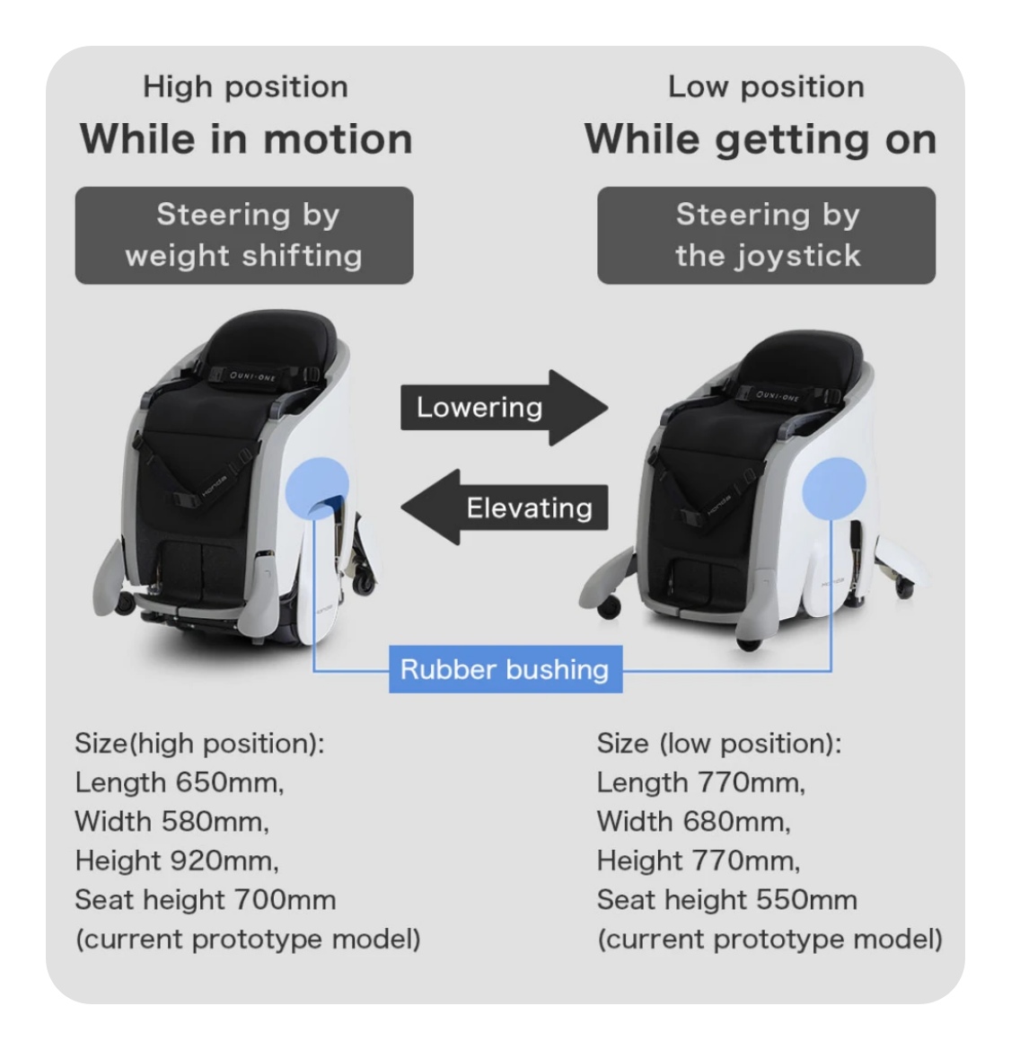 혼다의 유니-원은 사용자가 손으로 조종하지 않고 몸을 기울이는 움직임만으로 앞, 뒤, 옆 또는 대각선으로 이동할 수 있는 혁신적인 디자인의 전동 휠체어의 느낌을 가지고 있습니다.