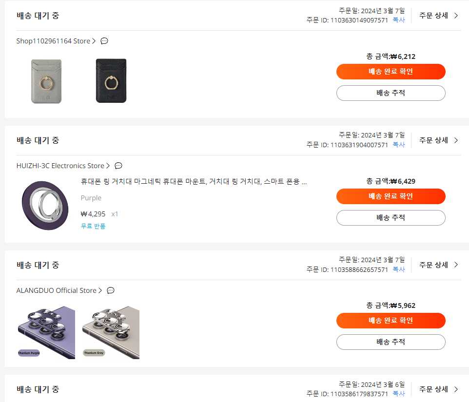 우선 구입한 제품은 알리익스프레스에서 휴대용 링 거치대 마그네틱 휴대폰 마운트 거치대라고 되어 있고 제품가격은 4295원이지만 배송비 포함 6,429원으로 배송비포함으로 생각했을 때 한국보다는 꽤 저렴합니다.