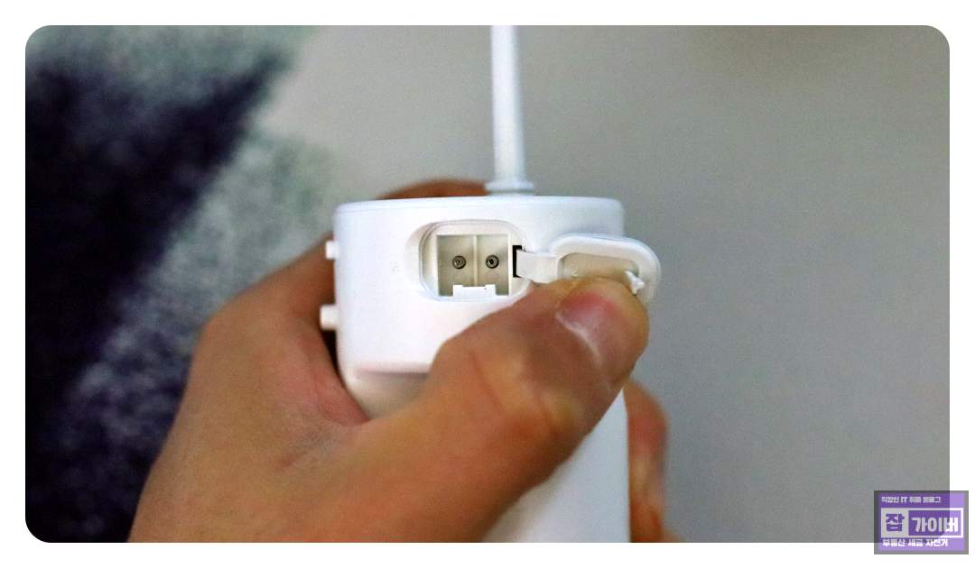 파나소닉 EW-DJ31의 디자인은 간결하면서도 세련되었습니다. 본체의 크기는 손에 쏙 들어오는 사이즈이며, 노즐을 본체에 보관할 수 있는 공간이 마련되어 있어 분실 우려가 없어 보였습니다. 또한, 물통이 투명하여 물의 잔량을 쉽게 확인할 수 있어서 편리했습니다.
