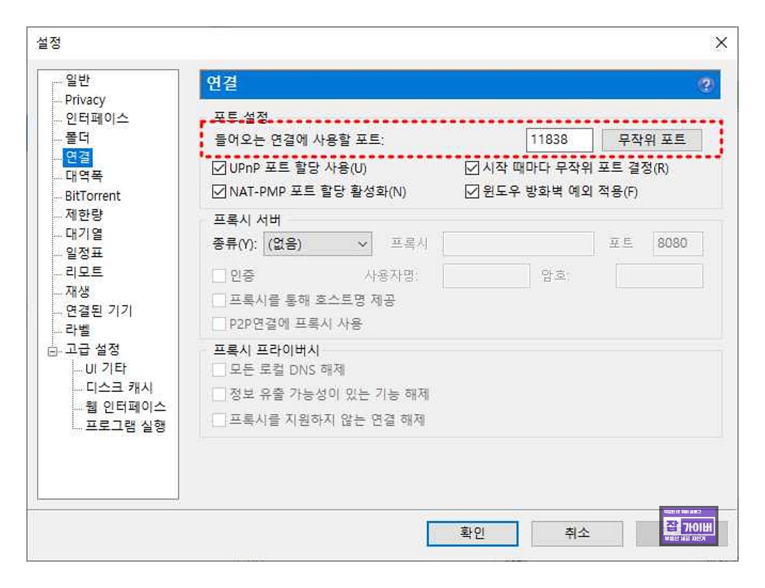 우선 토렌트 삭제하기 전 설정에서 포트설정에서 무작위 포트를 설정 한 뒤 다운로드가 되는지 확인해봅니다.