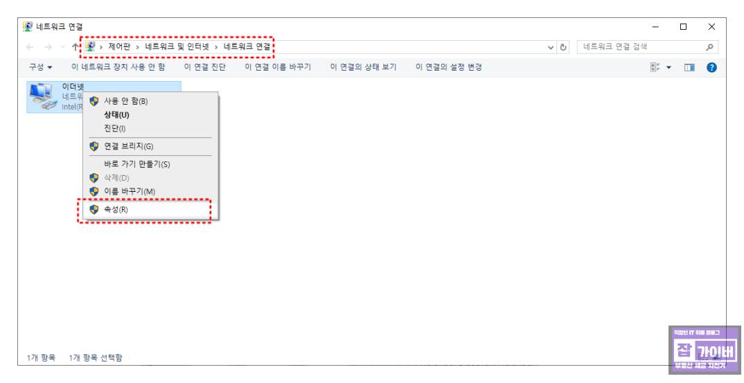 윈도우에서 '네트워크 연결'로 이동해 사용 중인 이더넷 아이콘에 마우스 오른쪽 버튼을 클릭합니다.