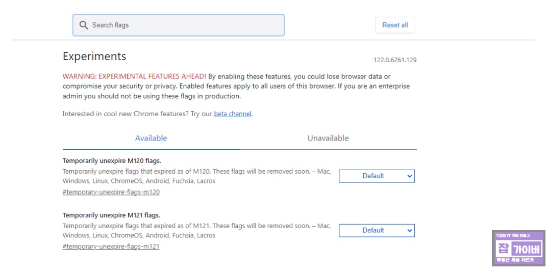크롬 브라우저의 flags 설정을 변경할 수 있는 화면이 나타납니다.