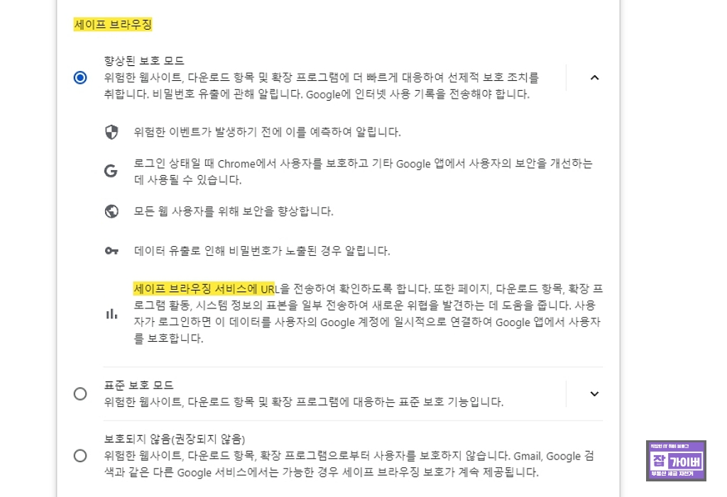 크롬 브라우저에서 사이트 설정의 모든 내용을 삭제하고, 향상된 보호 모드 설정에서 향상된 모호모드가 아닌 표준 보호모드로 변경합니다.