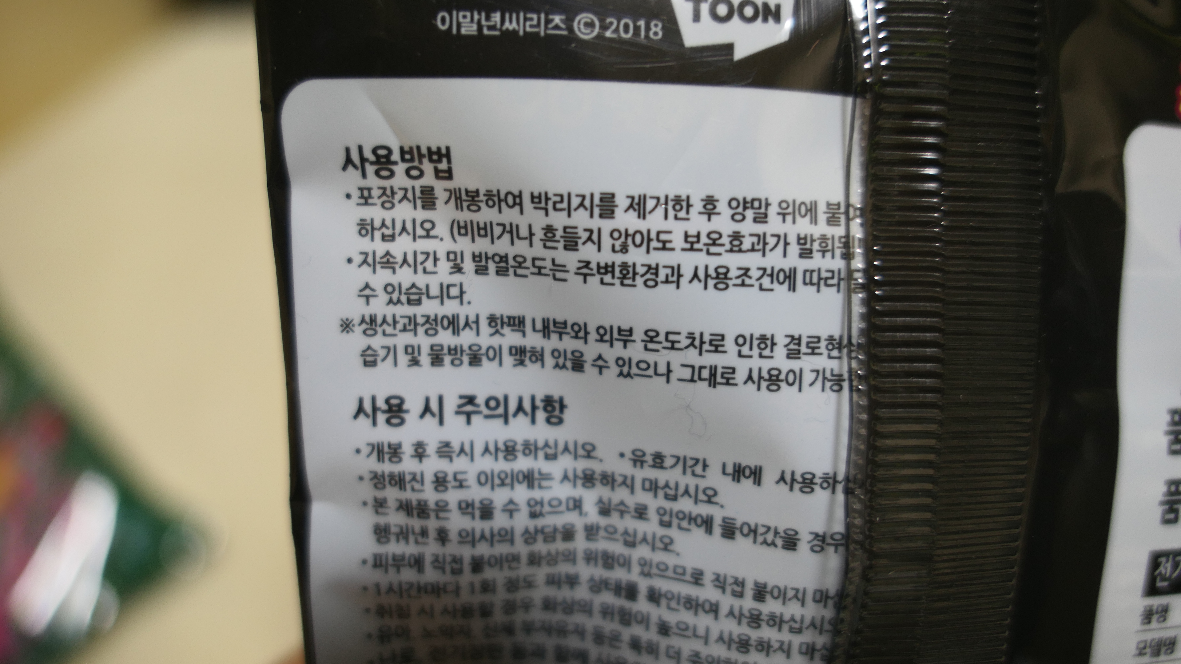 이 핫팩은 발등에 부착하는 방식으로 사용되며, 추운 날씨에 발에 부착하면 신발 안이 따뜻해집니다.
