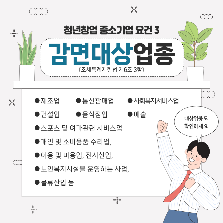 특히 사업장 소재지가 수도권 외인 경우 나이와 무관하게 감면받을 수 있고, 수도권 내라도 창업 시점이 청년(만 15세 이상 34세 이하)이거나 1년간 수입금액이 4800만원에 미달이면 감면 대상이 됩니다.