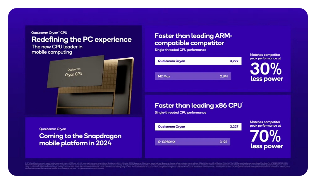 퀄컴은 지난 26일(현지시간) 미국 하와이에서 열린 스냅드래곤 서밋 2023 행사에서 스냅드래곤 X 엘리트의 벤치마크 테스트 결과를 공개했습니다. 이 칩은 퀄컴이 자체 개발한 오라이온(Oryon) CPU를 탑재했습니다.
