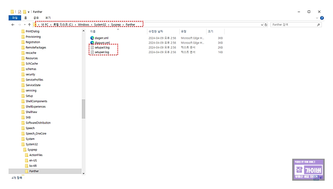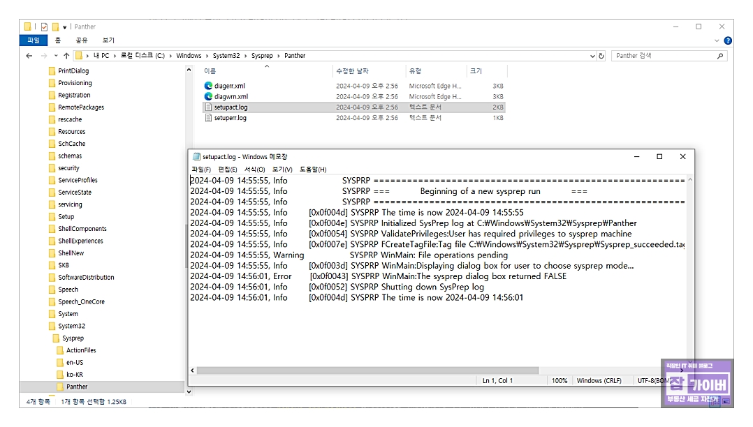 먼저, %WINDIR%System32\Sysprep\Panther 폴더로 이동하여 setupact.log 파일을 엽니다.