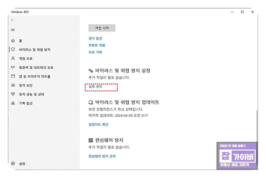 | 2번 | 실시간 보호 끄기 | ‘바이러스 및 위협 방지 설정’ → ‘설정 관리’ → ‘실시간 보호’를 잠시 꺼 둠 |