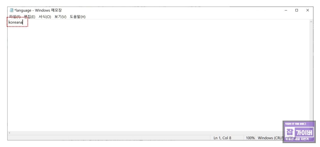 해당 경로로 이동한 후, LANGUAGE.TXT 파일을 메모장으로 실행 후 파일을 열어서 "English"로 되어 있는 부분을 "Koreana"로 변경합니다.