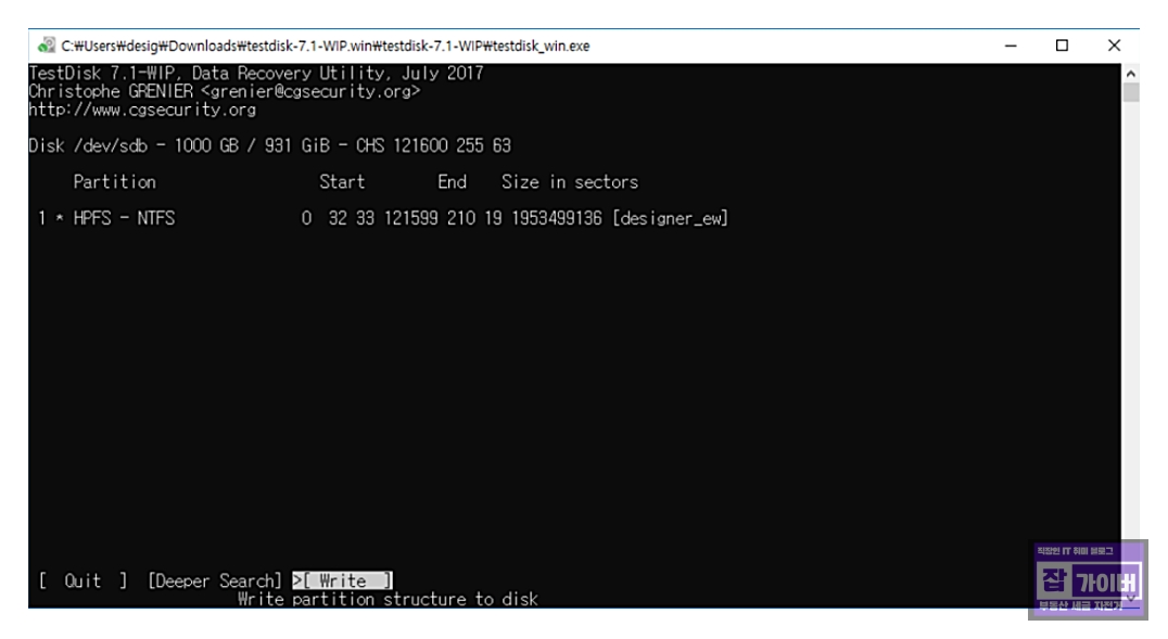 - 손상된 파티션을 찾았다면, 해당 파티션을 강조표시하고 'Write'를 선택하여 파티션 테이블을 복구합니다.