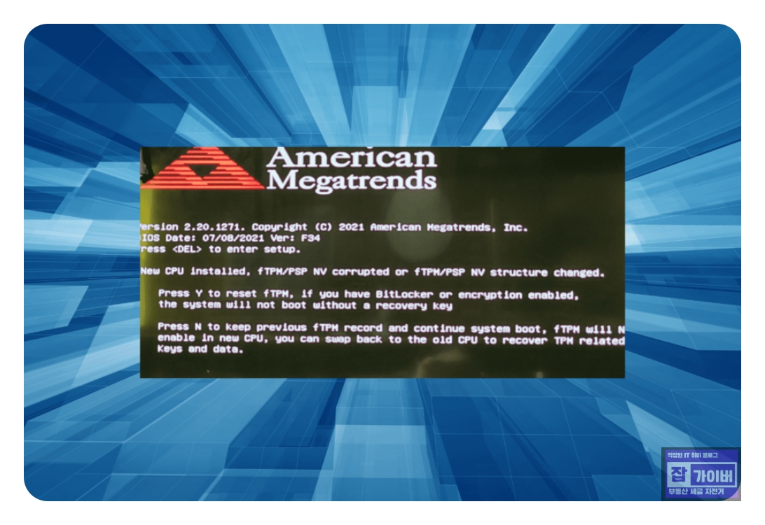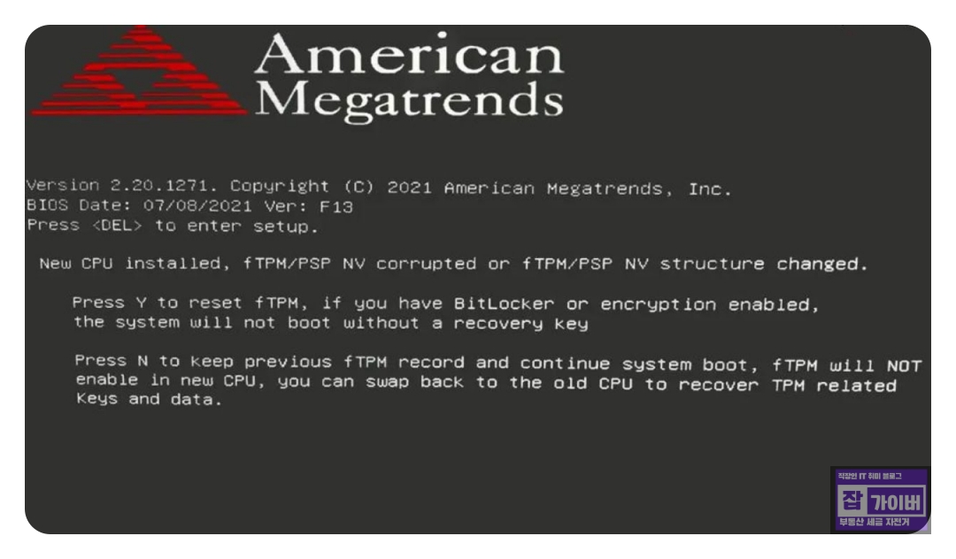 그런데 실제 사용 중인 PC에서 AMD fTPM 설정을 활성화했음에도 불구하고, 부팅 중 New CPU installed, fTPM/PSP NV Corrupted or fTPM/PSP NV structure changed.와 같은 오류 메시지가 발생하는 상황이 발생하는데 이 문제가 발생하는 원 및 해결방법에 대해 알아보겠습니다.